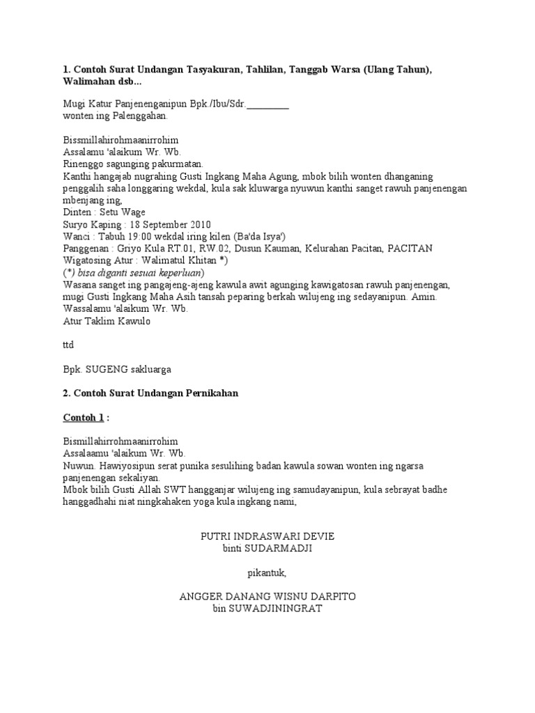 Contoh layang ulem bahasa jawa ulang tahun 3 happy birthday world. Contoh berita jawa detil gambar online. Contoh surat undangan pribadi ulang tahun suratmenyuratnet. Bapak lan ibu ingkang satuhu kula bekteni kenanthenan serat menika. Contoh layang ulem khitanan bahasa jawa photograph results. Mbok bilih gusti allah swt hangganjar wilujeng ing samudayanipun kula sebrayat badhe hanggadhahi niat ningkahaken yoga kula ingkang nami.