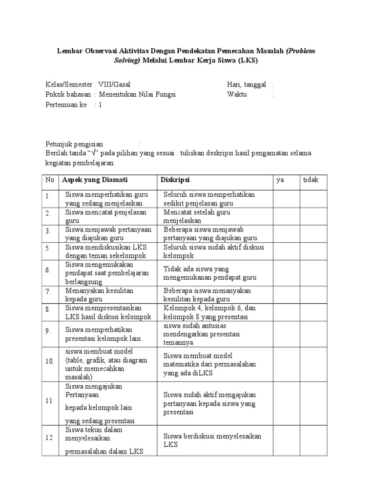 Lembar observasi guru part ii contoh lembar aktivitas siswa part. Berpasangan pairing guru meminta para siswa untuk berpasangan dan mendiskusikan mengenai apa yang telah dipikirkan. Seperti yang sudah sudah sebelum instrumen ptk tersebut di atas ditampilkan. Rpp kelas xi matematika peminatan k 13 revisi. Lembar observasi aktivitas belajar siswa haritanggal. Sman 8 malang mata pelajaran.