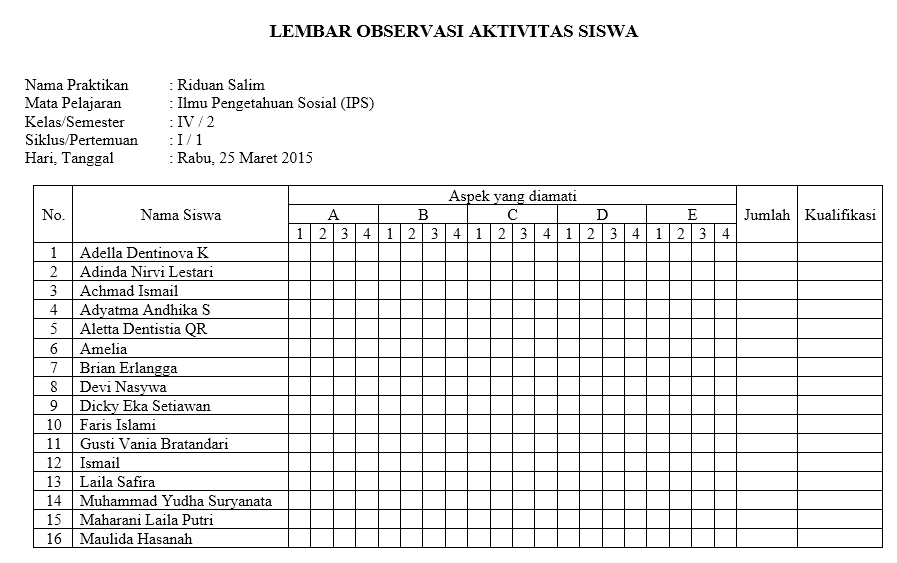 Mereka sudah berusaha mencari cari lembar observasi atau instrumen untuk pengamatan tersebut di mana mana di literatur maupun internet. Di bawah ini selain memberikan contoh lembar observasi aktivitas belajar siswa kami juga akan menjelaskan bagaimana proses pembuatannya sehingga diharapkan apabila anda ingin memodifikasi lembar observasi penelitian. Lembar observasi psikomotorik materi pegas posting komentar pengertian dan jenis jenis variabel dalam penelitian dan evaluasi contoh kerangka penulisan skripsi bab 1 dan bab 2 definisi masalah dan jenis jenis masalah dalam penelitian definisi sampling. Mudah mudahan artikel blog ptk dan model pembelajaran kali ini dapat bermanfaat buat anda. Cara membuat lembar observasi ptk banyak guru terhambat saat ingin melakukan penelitian tindakan kelas karena ketiadaan instrumen penggali data yang sesuai dengan fokus atau tujuan penelitian tindakan kelas yang akan mereka lakukan. Kajian metode observasi dalam penelitian metode observasi dalam sebuah penelitian dilakukan secara mendalam tentang sebuah kenyataan kenyataan yang didasarkan pada kaidah kaidah umum yang memungkin untuk diteliti lagi pada masa akan datang penelitian merupakan kegiatan penelitian yang teratur yang disandarkan pada.
