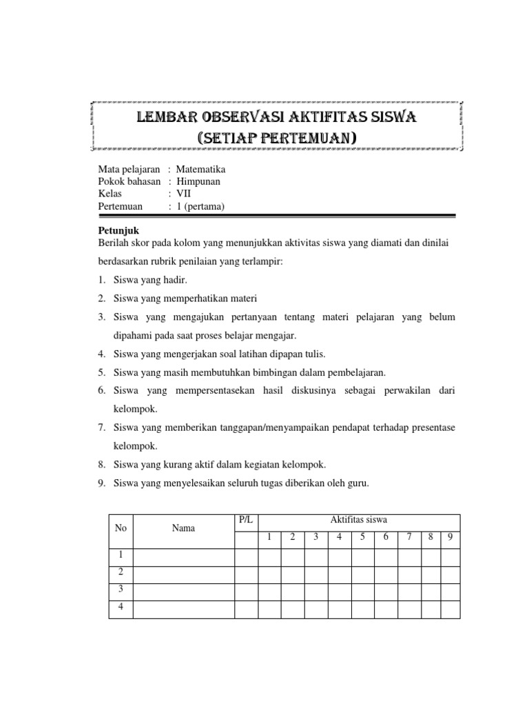 Contoh lembar observasi siswa. Catat hasil pengamatan anda dengan melengkapi format berikut ini atau menuliskannya di tempat lain bila. Lembar observasi ini saya buat ketika saya sedang melaksanakan penelitian di mana diharuskan untuk mengisi lembar observasi pada tiap tiap pertemuan pembelajaran di kelas. Berikut ini beberapa contoh lembar observasi yang dapat digunakan oleh seorang observer pengamat ketika mengobservasi kelas yang sedang diteliti. Kira kira apa saja lembar observasi yang harus disiapkan oleh seorang peneliti. Contoh lembar observasi aktivitas belajar siswa lembar observasi aktivitas belajar siswa haritanggal. Contoh instrumen ptk lembar observasi aktivitas guru setelah menerbitkan tulisan mengenai contoh lembar observasi aktivitas siswa dalam pembelajaran menulismengarang kali ini kembali blog penelitian tindakan kelas akan memberikan contoh lembar observasi yaitu lembar observasi aktivitas guru dalam pembelajaran.