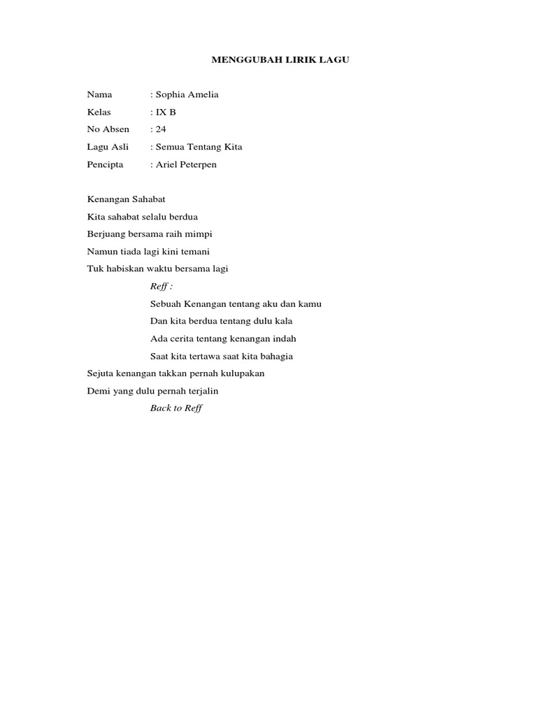 Contoh lirik lagu tentang sahabat. Isi liriknya tentang hari hari kita yang kadang menyedihkan namun sahabat bisa menawarkan eksistensi atau bantuannya untuk membuat kita lebih teduh. Istimewanya lagu rihanna memiliki lirik dan nada yang catchy. Apalagi lagu ini jadi soundtrack salah satu film paling emosional laskar pelangi yang juga berkisah soal persahabatan. Lagu kematian ini biasanya mengandung lirik lagu untuk mengenang meninggalnya sahabat atau keluarga. Langsung saja kita simak soalnya berikut ini. Jika kamu punya sahabat dan teman karib kamu bisa belajar bersama dengan menyenangkan.