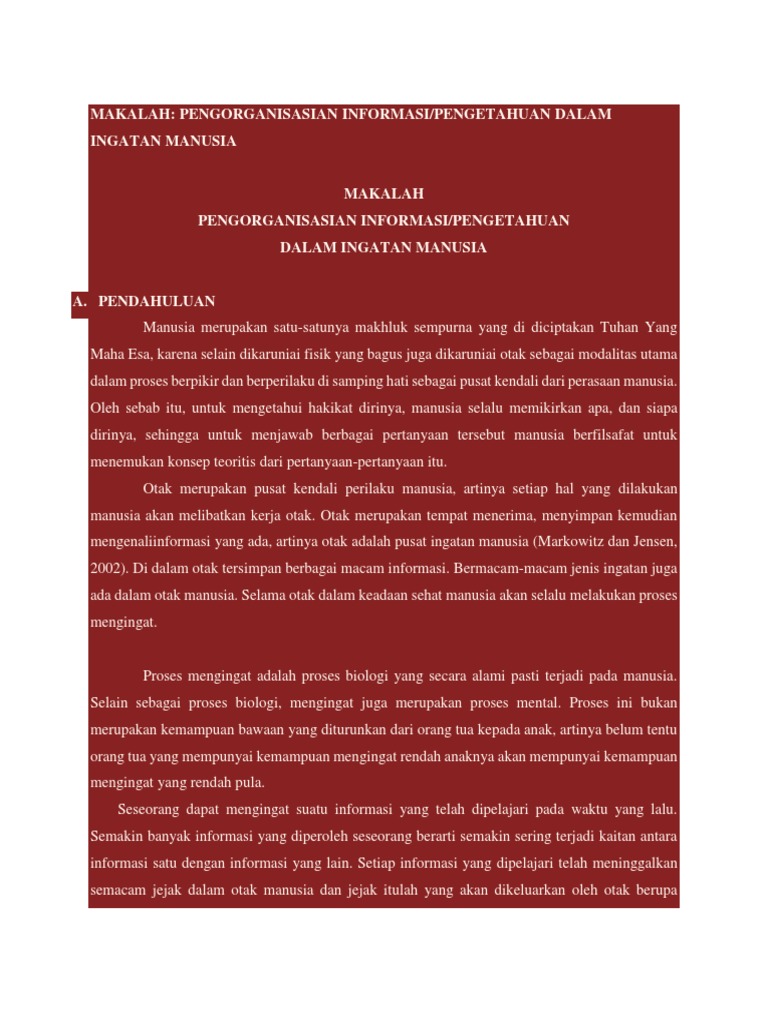 Contoh makalah pengorganisasian informasi pengetahuan dalam ingatan manusia. Ingatan sangat penting bagi manusia karena ingatan adalah tempat penyimpanan pengetahuan bagi manusia. Proses mengingat atau memori banyak dipengaruhi oleh berberapa faktor yaitu. Selama otak dalam keadaan sehat manusia akan selalu melakukan proses mengingat. 1 faktor individu dimana proses mengingat akan lebih efektif apabila individu memiliki minat yang besar motivasi yang kuat memiliki metode tertentu dalam pengamatan dan pembelajaran memiliki kondisi fisik dan kesehatan. Otak merupakan tempat menerima menyimpan kemudian mengenaliinformasi yang ada artinya otak adalah pusat ingatan manusia markowitz dan jensen 2002. Pengolahan informasi merupakan perluasan dari bidang kajian ranah psikolog.