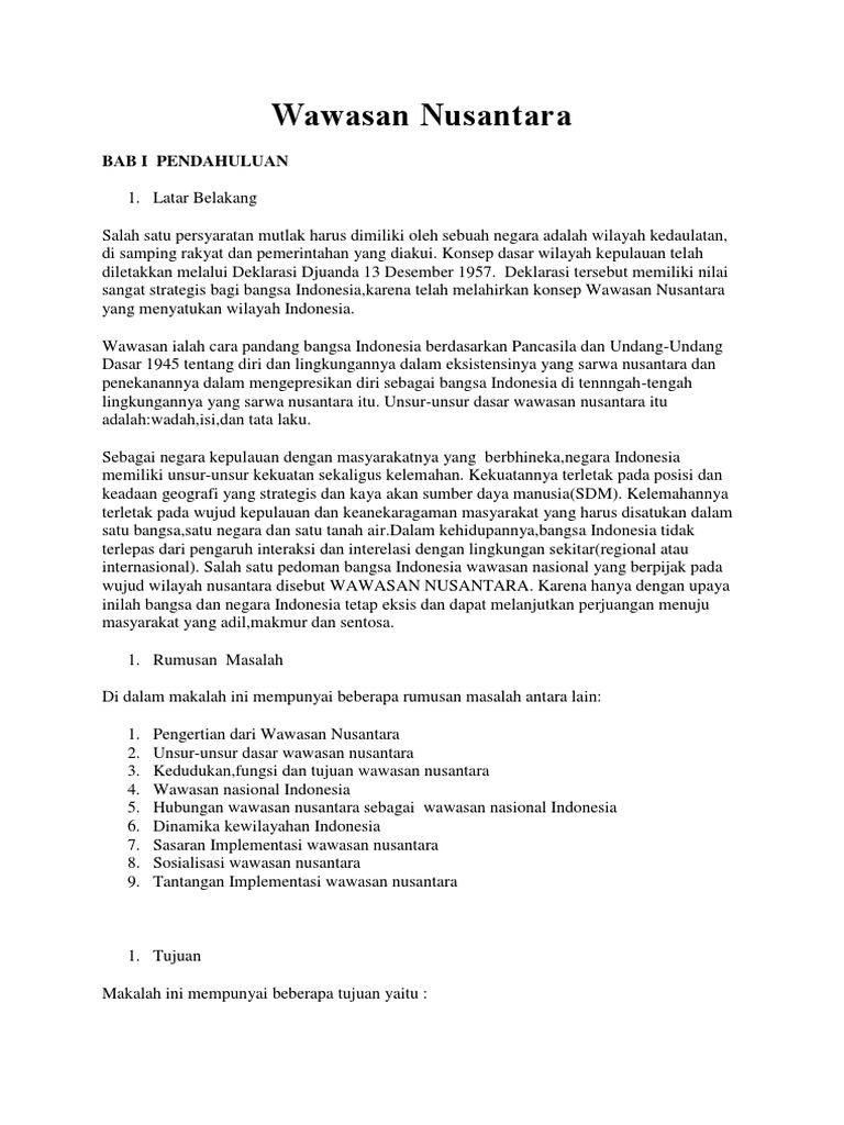 Contoh makalah wawasan nusantara ini bisa didownload dalam format document atau docx yaitu format file yang bisa diedit dengan menggunakan aplikasi pengolah kata atau software word processor yang biasa digunakan di komputer atau laptop anda untuk mengetik yaitu seperti microsoft office open office atau pun software word processor lain misalnya untuk android seperti polaris office microsoft. Konsep dasar wilayah kepulauan telah diletakkan melalui deklarasi djuanda 13 desember 1957. Erfa ekaptian putra 0910320251 administrasi bisnis kelas d fakultas ilmu administrasi universitas brawijaya malang 2009 bab i pendahuluan. Wawasan nusantara merupakan cara pandang terhadap bangsa indonesia dengan orientasi menjaga kesatuan dan persatuan untuk mencapai tujuan nasional. Pengertian mengenai wawasan nusantara sebenarnya ada beberapa versi. Wawasan nusantara adalah cara pandang sikap bangsa indonesia mengenai diri dan bentuk geografinya berdasarkan pancasila dan uud 1945.