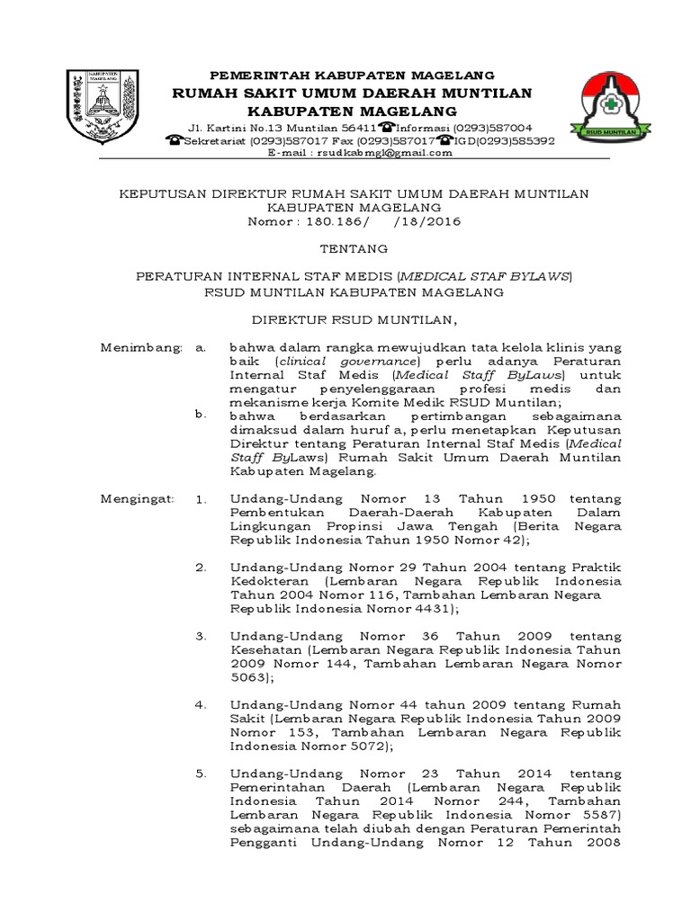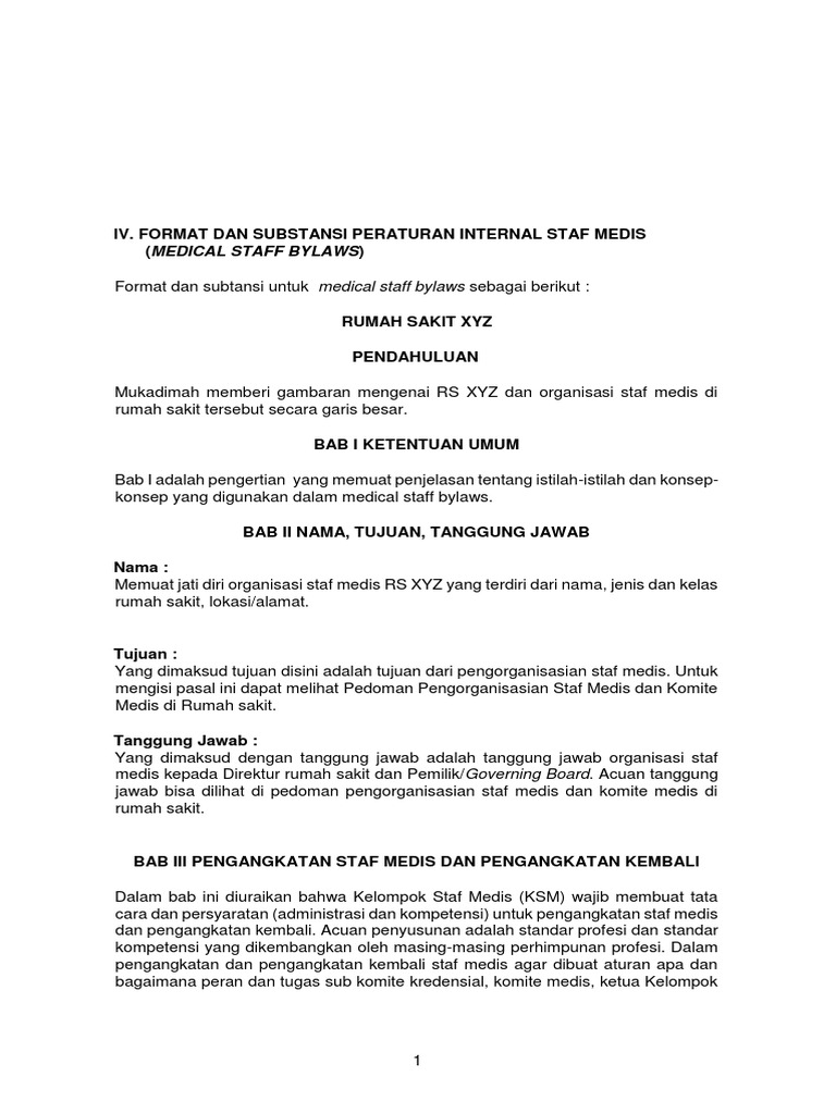 Contoh medical staff bylaws rumah sakit. Sebagai contoh seorang tenaga medis pada pagi hari memberikan pelayanan dipoliklinik atau unit rawat jalan siang hari bias memberikan pelayanan di unit rawat inap dan di malam hari dapat memberikan layanan di kamar operasi atau ruangan tindakan lainnya. Maka medical staff bylaws rumah sakit juga dapat diartikan merupakan produk hukum tertinggi di staf medis. Peraturan internal staff medis tersebut bisa merupakan peraturan internal yang berdiri sendiri tetapi juga bisa merupakan salah satu ketentuan di dalam peraturan internal korporate atau corporate bylaws. Subandi achmadi spog. Bandung 08 09 april 2020 download brosur pelatihan. Berdasarkan uraian tersebut diatas maka dapat ditarik kesimpulan.