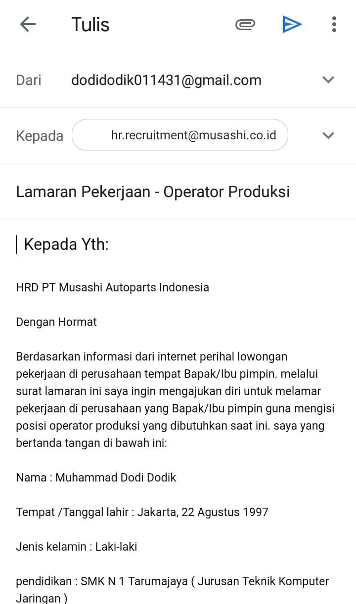Untuk mengirim lamaran lewat email saya sarankan kalian menulis kata kata body email ini sesuai dengan format standar surat lamaran kaidah eyd lihat contoh gambar diatas kebanyakan para pelamar diluar sana tidak mengisi kata kata apapun di body email ini hanya lampiran saja hal itu merupakan kesalahan fatal karena body email justru ini yang menjadi inti point email lamaran kalian. Selamat mencoba dan berburu pekerjaan secara online. Dulu surat lamaran kerja memang selalu dikirimkan lewat pos atau diantar langsung ke perusahaankantor. Catat apa saja yang berpotensi membuat lamaran anda tak segera dibalas hrd. Namun bukan berarti pada body email kamu bisa membiarkannya dalam keadaan kosong. Demikian cara dan contoh mengirim surat lamaran via email sebenarnya tidaklah susah asalkan semua berkas lamarannya sudah ada.