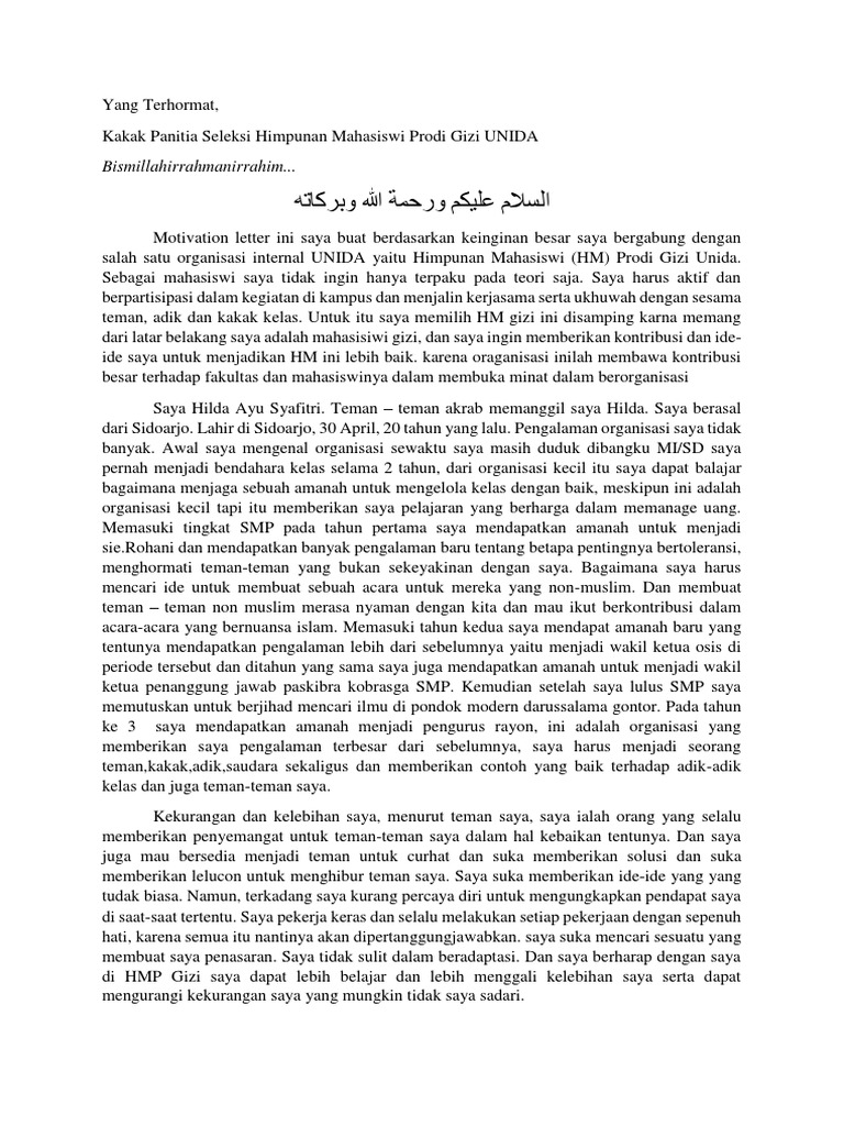 Dan pada tahun 2013 2015 menjadi anggota divisi kewirausahaan oase organisasi akademika smart ekselensia. Melalui surat tersebut peluang untuk lolos dalam suatu mekanisme rekrutmen dapat ditingkatkan. Sekarang saya sudah berada di bangku kuliah bukan lagi anak sma untuk itu saya sadar sebagai seorang mahasiswa fakultas ekonomika dan bisnis saya tidak ingin menjadi mahasiswa kupu kupu dalam dunia perkuliahan saya. Motivation letter merupakan sebuah surat yang berisi tentang penjelasan akan motivasi kita untuk bergabung kedalam sebuah perusahaan ataupun untuk melamar sebuah beasiswamotivation letter merupakan surat yang dianggap sangat penting yang akan mendampingi cv atau curriculum vitae karena. Saya mengikuti lomba story telling bussines plan debate dan speech contest. Contoh motivation letter ikut organisasi penulis muhammad cahyo.