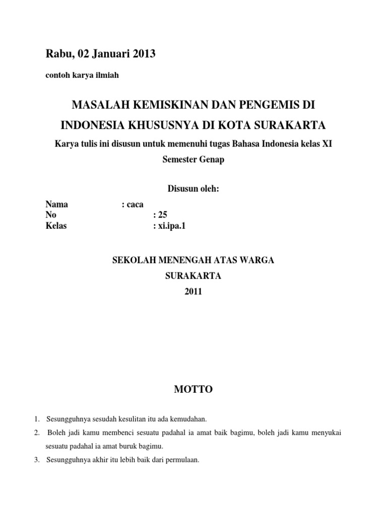 Contoh halaman motto dan persembahan dalam karya tulisilmiah motto 1. Terus terang adanya motto bagi saya adalah sebagai ungkapan atau motivasi tersendiri dalam mengerjakan suatu karya ilmiah skripsi saat di. Kesempatan hanya da ta ng satu kali begitu juga kepercayaan. Contoh karya tulis ilmiah kamis 21 februari 2013. Contoh karya tulis ilmiah populer sederhana formal non formal tentang pendidikan sampah pergaulan bebas pencemaran air bahaya rokok narkoba kesehatan kenakalan remaja lingkungan yang baik dan benar. Lengkap cara membuat karya tulis tangan yang sistematis.