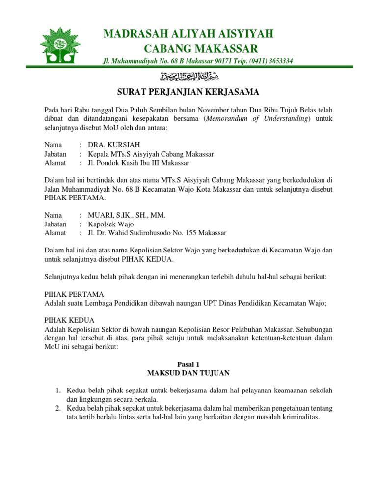 90953 surat perjanjian kerjasama pada hari tanggal bulan tahun telah dibuat dan ditandatangani kesepakatan bersama memorandum of understanding untuk selanjutnya disebut mou oleh dan antara. Contoh mou sekolah dengan kepolisian.