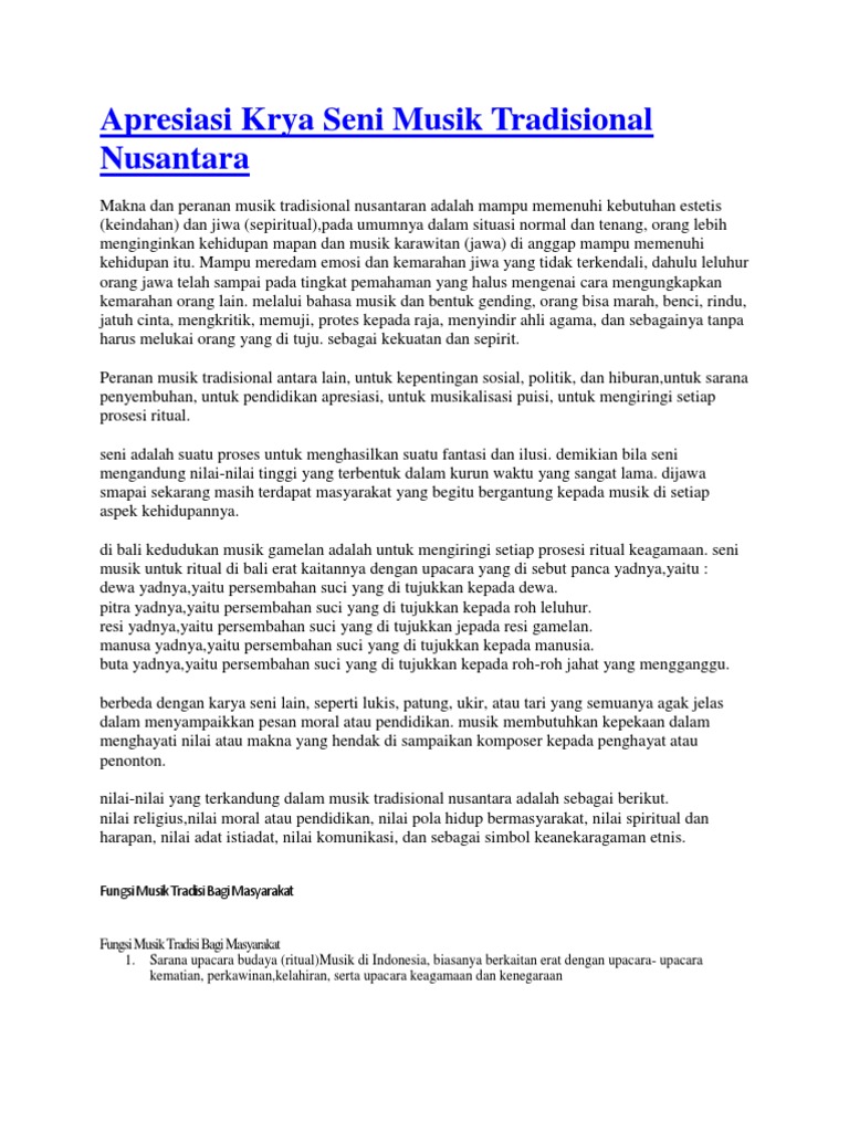 Musik tradisional nusantara pada sekarang ini mungkin tidak banyak dari kita yang mengetahui apa itu musik tradisional indonesia. Musik tradisional nusantara pelajaran seni budaya dan ketrampilan smp mts kelas viii hampir semua daerah yang ada di indonesia ini mempunyai musik daerah masing masing yang berisi mengenai gambaran kehidupan masyarakat daerahnya tersebut secara umum.