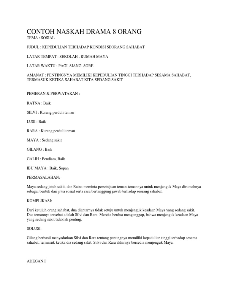 Contoh naskah drama untuk 8 orang. Naskah drama yang berjudul hanya bisa menyesal ini melibatkan delapan orang pemain yang masing masing memiliki karakteristik atau sifat yang unik. Berry blog kali ini ingin share mengenai contoh naskah drama 8 orang yang lengkap dan keren untuk sobat semua jadi bagi sobat yang sedang mencari contoh teks naskah drama yang jumlah pemainnya 8 orang baik cewek atau pun cowok atau tentang cinta kekeluargaan persahabatan legendasejarah dan lain lain maka sobat bisa dapatkan di berry blog dan sobat juga bisa mengirimkan contoh contoh drama. Contoh naskah drama lucu bahasa sunda untuk tujuh orang pemain contoh naskah drama lucu untuk 7 orang di hiji desa hirup salaki jeung pamajikan nu ges kolot cicing ngan ukur duaan ku sabab anak anakna sakabehna geus narikah kabeh hiji waktu si aki keur diuk disisi teras imahna. 14 contoh naskah drama. Contoh naskah drama anak sekolah untuk 8 orang deskripsi drama judul. Karakter sifat pemain memberikan warna dan ciri khas tersendiri jika naskah ini dimainkan atau dipentaskan.