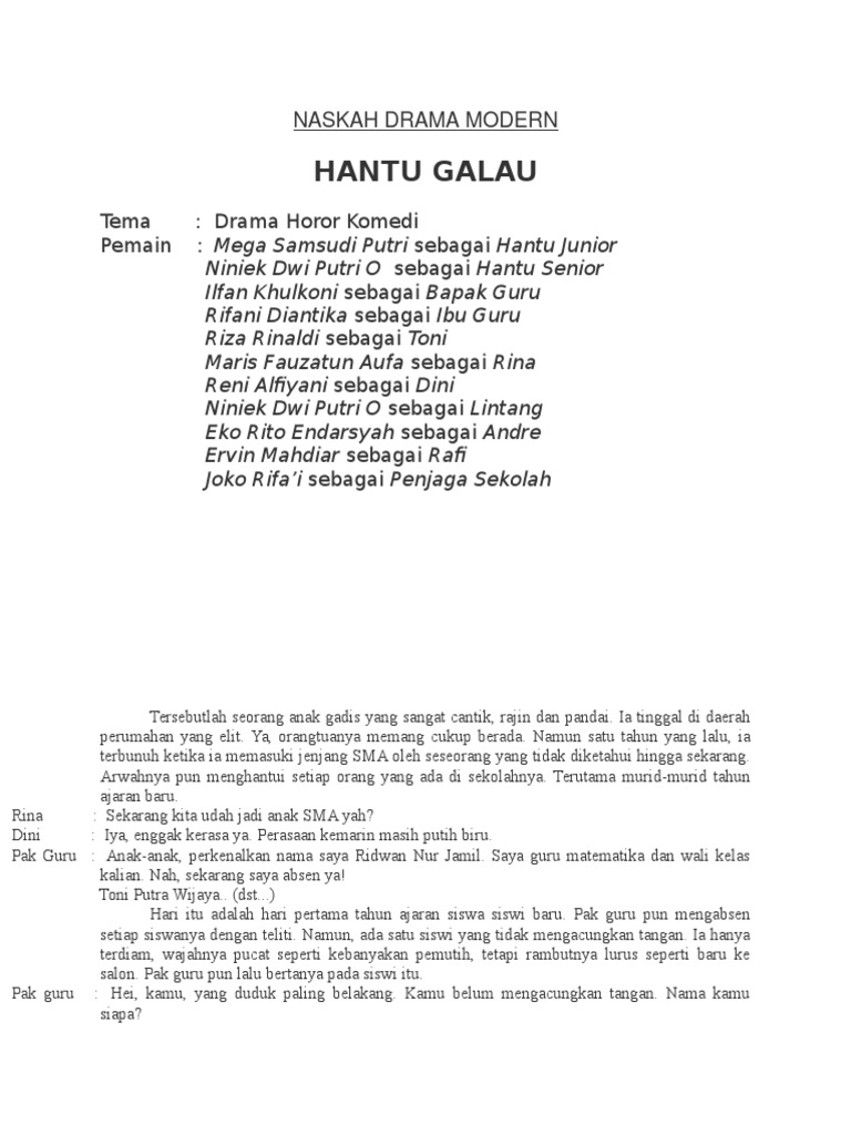 Drama horor komedi pemain. Walaupun baru 1 semester masuk di sekolah sma tetapi mereka dipandang. 14 contoh naskah drama. Mustofa dan rhopieck adalah sahabat yang hangat mengalahkan mentari mreka teman sekelas di sekolah ma darussalam ngentrong mereka juga tetangga satu kompleksyang samgat akrab dan rukun tetangga. Teater non tradisional atau teater modern secara umum adalah teater yang penyampaian ceritanya berdasarkan pada naskah dan sumber ilmunya dari dunia barat dan juga bahannya dari kejadian kejadian sehari hari atau karya sastra. Tapi jangan khawatir.