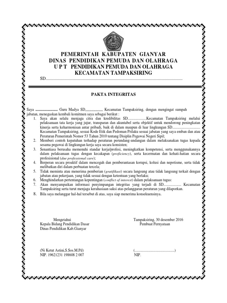 Kepala sekolah di lingkungan pemerintahan kota bandung berjanji pada diri sendiri dan berkomitmen melaksanakan seluruh tugas fungsi tanggung jawab wewenang dan peran sesuai dengan peraturan perundang undangan. Inilah contoh fakta integritas untuk guru baik pns maupun non pns 1. Menumbuhkan keterbukaan dan kejujuran serta mempelancar tugas yang berkualitas efektif dan akuntabell dan termasuk untuk mewujudkan pribadi yang bertanggung jawab dan. Contoh pakta integritas pns terbaru 192000 download info pakta integritas pns pakta integritas menyediakan saranamedia bagi pemerintah perusahaan swasta dan masyarakat untuk mencegah terjadinya korupsi kolusi dan nepotisme dalam sistem pemerintahan terutama dalam kontrak kontrak pemerintah public contracting. Contoh pakta integritas pns terbaru pakta integritas menyediakan saranamedia bagi pemerintah perusahaan swasta dan masyarakat untuk mencegah terjadinya korupsi kolusi dan nepotisme dalam sistem pemerintahan terutama dalam kontrak kontrak pemerintah public contracting. Memberi contoh dalam kepatuhan terhadap peraturan perundang undangan dalam melaksanakan tugas bagi pegawai di lingkungan pd bpr bank sleman.