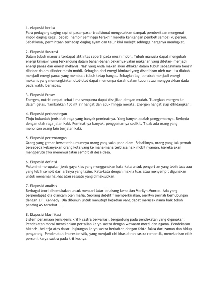 Contoh paragraf eksposisi klasifikasi. Paragraf klasifikasi merupakan salah satu pengembangan paragraf eksposisi sehingga paragraf ini bertujuan untuk memberikan informasi yang sangat jelas kepada para pembacanya. Paragraf klasifikasi juga diartikan sebagai pengembangan paragraf eksposisi menjadikan paragraf ini memiliki tujuan untuk memberikan informasi yang. Contoh paragraf eksposisi apabila kita berbicara tentang jenis jenis paragraf pasti tidak akan ada habisnyasetelah belajar tentang paragraf argumentasi dan paragraf deskripsi pada artikel sebelumnyapada kesempatan yang berbahagia ini kita akan bersama sama mempelajari tentang paragraf eksposisi. Teks eksposisi adalah karangan yang menyajikan sejumlah pengetahuan atau informasi. Pemerintah akan memberikan bantuan pembangunan rumah atau bangunan kepada korban gempa.