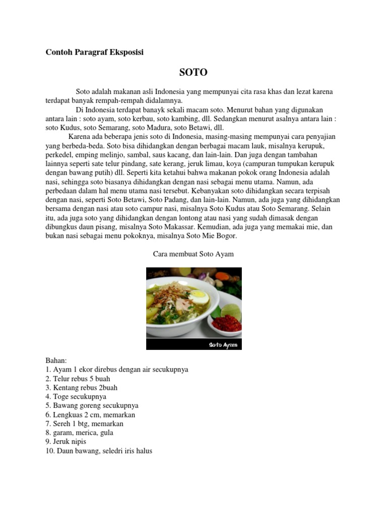 Tema yang bisa dipakai untuk paragraf ini bisa apa saja termasuk makanan. Jika pembaca ingin mengetahui beberapa contoh paragraf jenis lain pembaca dapat membuka dua artikel berikut yaitu contoh paragraf persuasi tentang lingkungan dan juga artikel paragraf contoh deskripsi ekonomi. Demikian beberapa contoh proses eksposisi paragraf dalam bahasa indonesia. Energen empat makanan sehat dan lima sempurna dapat disajikan dengan mudah. Tambahkan 150 ml air panas dan aduk hingga merata. Sebuah gagasan yang terlalu umum memerlukan ilustrasicontoh yang konkret.