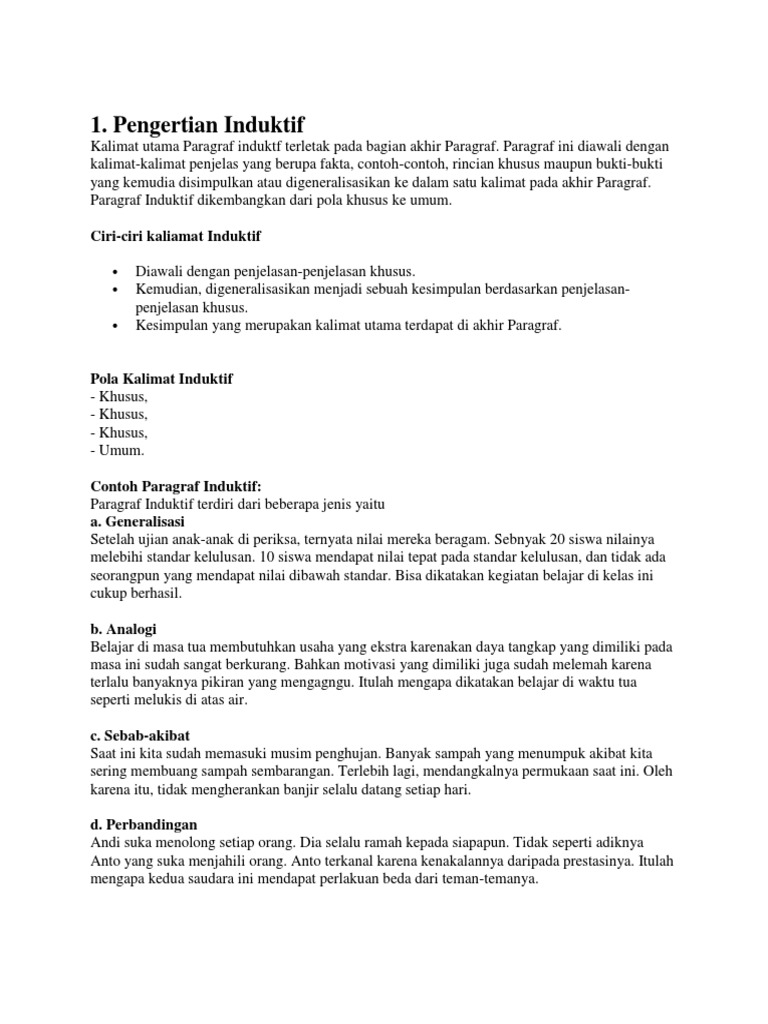 Contoh paragraf khusus umum. Kalimat utama terletak di awal paragraf. Contoh paragraf induktif sebelum masuk ke contohnya sudah tahukah kamu apa pengertian dari paragraf induktif. Penjelasan umum berisi atau menyajikan informasi pembukaan atau deskripsi pendahuluan dari konten yang dibahas di bagian selanjutnya. Biasanya wacana paragraf campuran polanya adalah kalimat yang bersifat umum berada di awal paragraf dan akhir paragraf dan kalimat yang berada di tengah memuat pernyataan khusus bisa berupa contoh atau rincian. Paragraf ini umumnya diawali dengan pernyataan yang bersifat umum kemudian dilengkapi dengan penjelasan yang khusus yang berupa contoh rincian khusus bukti bukti dan lain sebagainya. Paragraf deduktif adalah sebuah paragraf yang kalimat utamanya berada pada awal atau baris pertama paragraf.