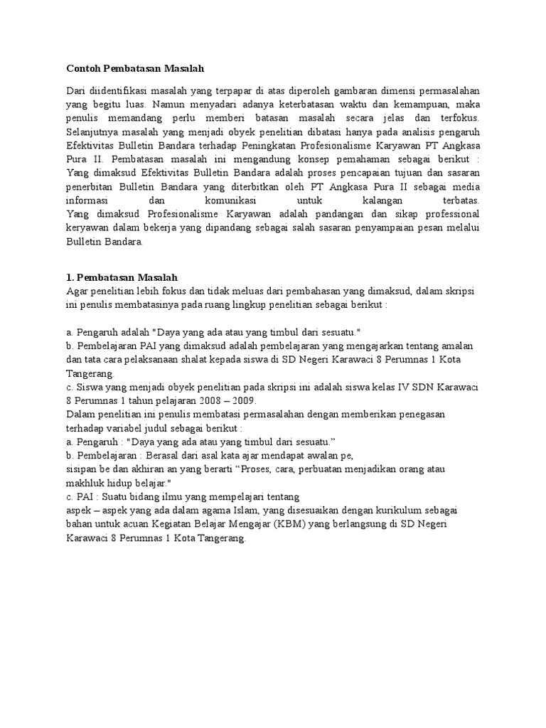 Contoh pembatasan masalah dalam skripsi. Nah untuk lebih jelasnya coba kalian simak ulasannya di bawah ini. Sesuai dengan rumusan masalah diatas maka batasan masalah yang di lampirkan yaitu. Hasil yang diperoleh dari sebuah penelitian yang mengenai tentang laporan terhadap posisi keuangan di suatu yayasan yaitu yayasan bunda ini bisa memakai suatu metode penulisan posisi keuangan yang berupa accurual basic. Menurunnya kinerja karyawan dalam melaksanakan pekerjaannya di pelabuhan domestik telaga punggur batam. Contoh batasan masalah sering kita menjumpai dalam pembuatan laporan baik itu karya ilmiah skripsi penelitian maupun bentuk laporan laporan lain terdapat batasan masalah di dalamnya. Batasan objek penelitian nahh berikut adalah contoh batasan masalah dalam skripsi untuk skripsinya bisa silahkan dilihat disini pembatasan dan perumusan masalah agar pembahasan tidak terlalu meluas penulis merasa perlu memberikan batasan serta rumusan permasalahan sebagai berikut.