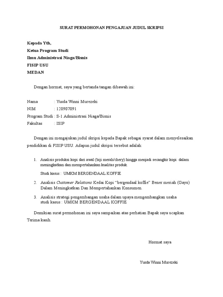 Contoh pengajuan judul skripsi. Contoh judul skripsi pada kesempatan kali ini kita akan mengulas tentang apa itu skripsi bagaimana struktur penulisannya secara ringkas dan terutama contoh contoh judulnya. Academiaedu is a platform for academics to share research papers. Berikut ini kami akan berikan kumpulan contoh judul skripsi semua jurusan terbarumeliputi judul skripsi fakultas ekonomi fakultas hukum fakultas ilmu budaya fakultas ekonomika bisnis fakultas ilmu sosial politik fakultas psikologi fakultas kedokteran fakultas kesehatan masyarakat fakultas matematika fakultas perikanan ilmu kelautan fakultas teknik dan lain lain. Sesusai permintaan teman semalam untuk dibuatkan contoh pengajuan judul skripsi bahasa inggris dan kali ini saya sempatkan untuk posting contoh pengajuan judul skripsi tersebuttapi sebelumnya mohon maaf karena format setiap kampus berbeda beda jadi postingan ini bisa digunakan sebagai acuan tapi tidak mutlak bahan belajar membuat pengajuan judul skripsi bagi mahasiswa semester akhir. Seperti yang anda ketahui sebelumnya bahwa untuk dapat meraih gelar sarjana anda harus melakukan sebuah penelitian terlebih dahulu terkait bidang ilmu konsentrasi yang anda pilih. Contoh jurnal pengajuan judul skripsi.