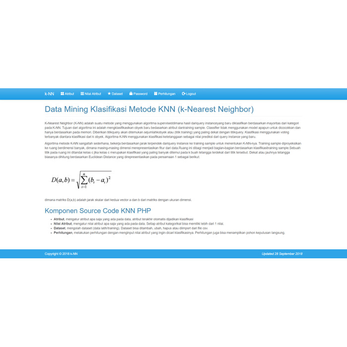 Untuk demo aplikasinya dapat dilihat pada link ini. Artinya apabila ada input objek baru yang tak dikenali algoritma knn akan mencari objek terdekat dengan objek yang baru diinput tadi di dalam database kemudian melakukan tindakan kepada objek yang baru diinput yang sama dengan tindakan yang dilakukan. Cara kerja algoritma k nearest neighbors knn k nearest neighbors melakukan klasifikasi dengan proyeksi data pembelajaran pada ruang. Gambar 23 rumus perhitungan jarak euclidean. Contoh diatas hanyalah contoh yang sangat sederhana dalam menerapkan algoritma ini. Kerusakan laptop yang dibahas disini adalah tentang kerusakan dibagian hardware didalam laptop.