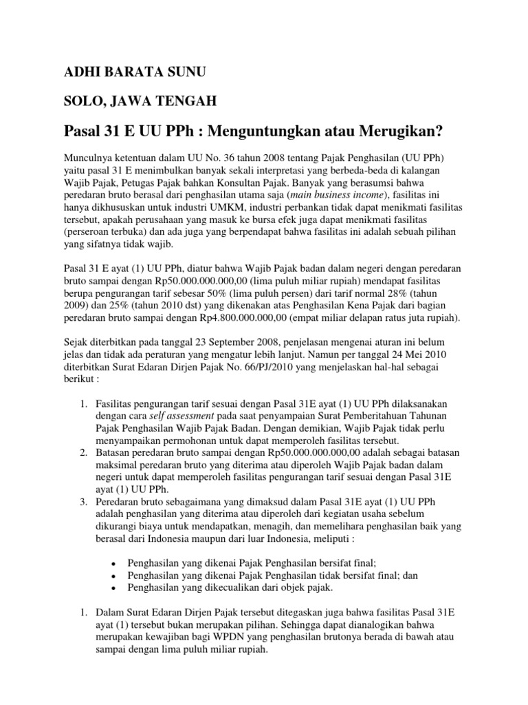 Pasal 31e 1 wajib pajak badan dalam negeri dengan peredaran bruto sampai dengan rp 5000000000000 lima puluh miliar rupiah mendapat fasilitas berupa pengurangan tarif sebesar 50 lima puluh persen dari tarif sebagaimana dimaksud dalam pasal 17 ayat 1 huruf b dan ayat 2a yang dikenakan atas penghasilan kena pajak dari bagian peredaran. Namun demikian berdasarkan pasal 17 ayat 2a undang undang pph tarif tersebut sejak tahun pajak 2010 menjadi 25. Fasilitas pasal 31e bukan merupakan pilihan penghitungan pph badan dengan menggunakan fasiltas pasal 31e bagi wajib pajak badan dalam negeri maupun bentuk usaha tetap bukan merupakan pilihan.