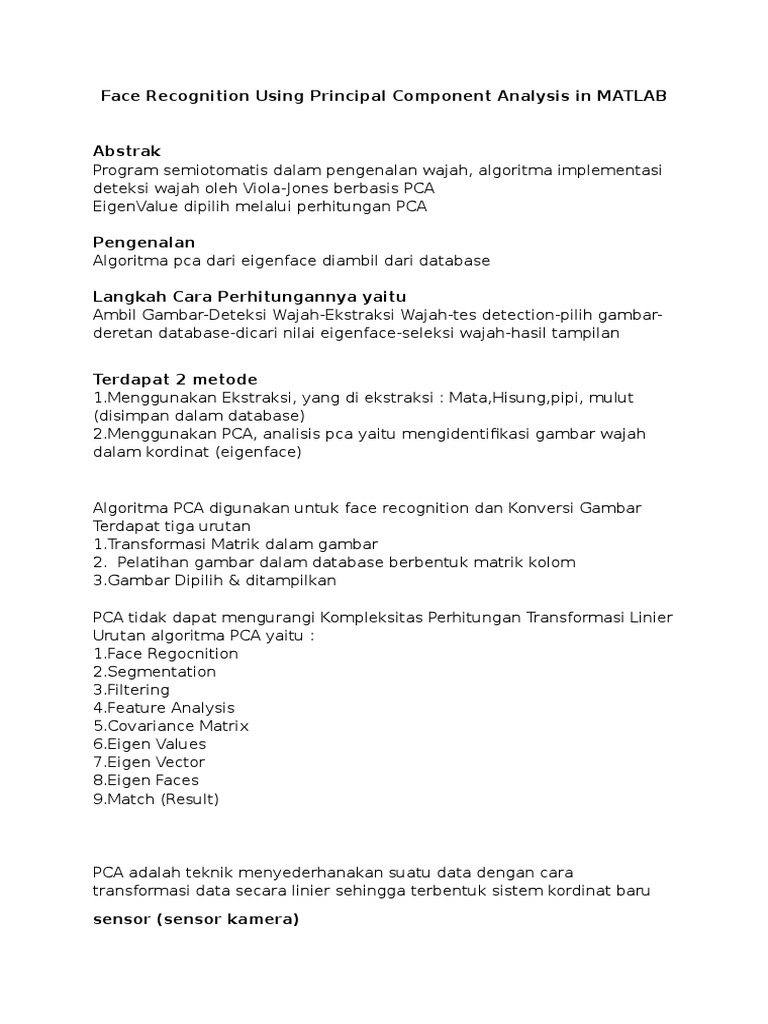 Analisis komponen utama principal component analysis 1. 09610121 jurusan matematika fakultas sains dan teknologi universitas islam negeri maulana malik ibrahim malang 2014. Analisis komponen utama principal component analysis adalah analisis multivariate yang mentransformasi variabel variabel asal yang saling berkorelasi menjadi variabel variabel baru yang tidak saling berkorelasi dengan mereduksi sejumlah variabel tersebut sehingga mempunyai dimensi yang lebih kecil namun dapat menerangkan sebagian besar keragaman variabel aslinya. Mengetahui akurasi dalam pengenalan citra daging sapi dan daging babi dengan ekstraksin principal component analysis pca dan jarak euclidean runtuk perhitungan jarak terdekat. Landasan teori misalkan 𝜒 merupakan matriks berukuran 𝑛𝑥𝑝 dengan baris baris yang berisi observasi sebanyak 𝑛 dari 𝑝 variat variabel acak 𝑋. Analisis komponen utama aku atau principal component analysis pca merupakan jenis analisis yang sederhana pada rumpun analisis multivariat interdependensi.