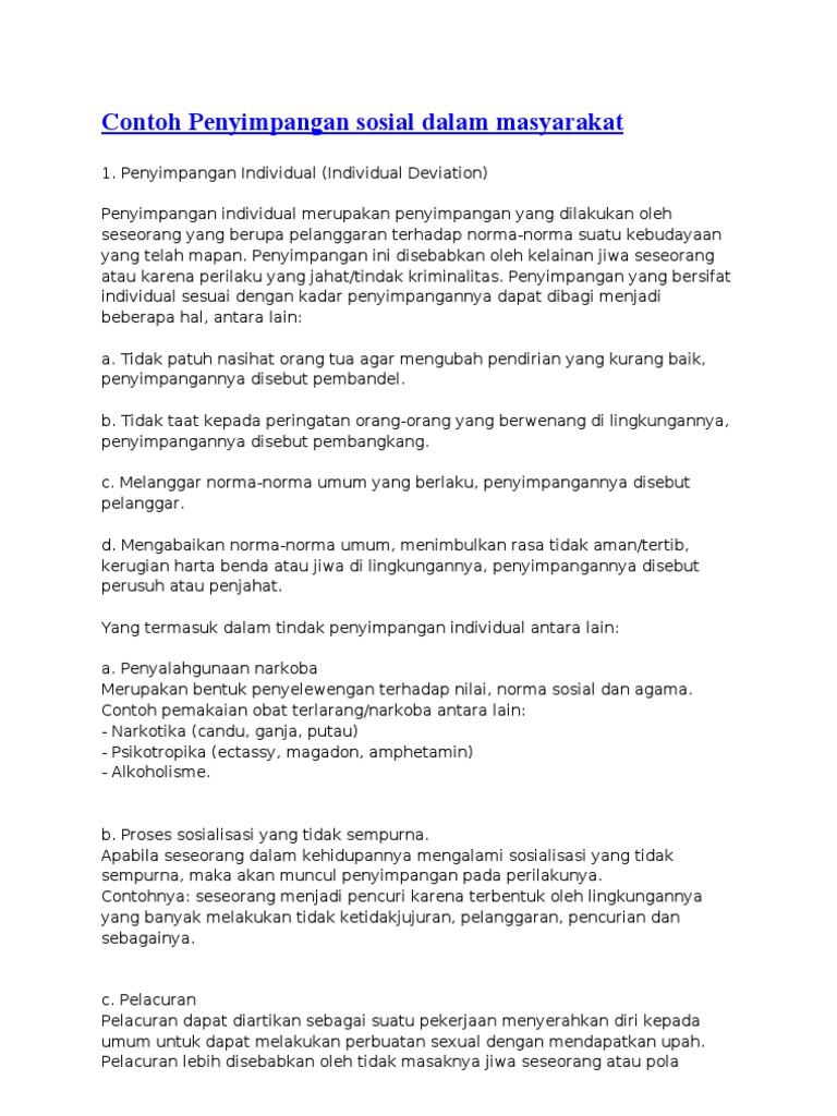Contoh penyimpangan sosial pengertian penyimpangan sosial adalah perilaku yang tidak sesuai dengan norma dan nilai niali kesusilaan baik dalam sudut pandang kemanusiaan dan agama secara individu maupun secaraa kelompok sebagai bagian daripada makhluk sosial. Penyimpangan sosial atau perilaku menyimpang sadar atau tidak sadar pernah kita alami atau kita lakukan. Penyimpangan sosial dapat terjadi dimanapun dan dilakukan oleh siapapun. Seseorang tidak dapat menilai diri sendiri apakah perbuatannya menyimpang atau tidak. Penyimpangan sosial merupakan bentuk perilaku yang dilakukan oleh seseorang yang tidak sesuai dengan norma dan nilai sosial yang berlaku dalam masyarakat. Penyimpangan sosial adalah semua bentuk perilaku yang menyimpang atau tidak sesuai dengan norma yang ada pada masyarakat.