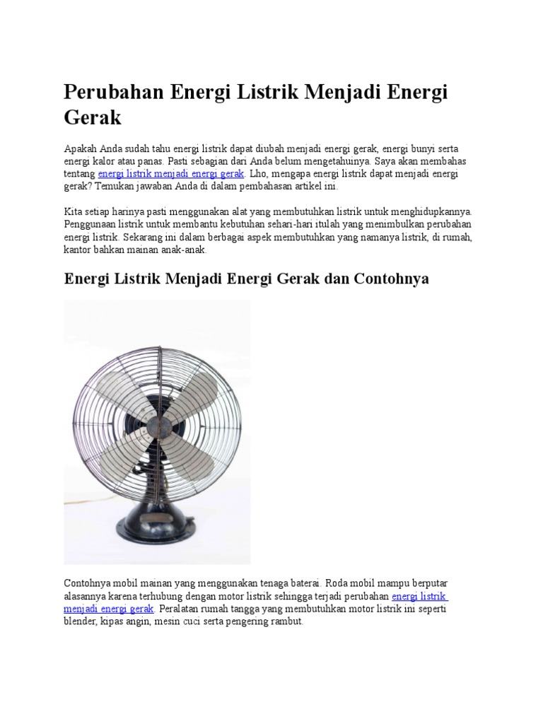 Energi listrik menjadi energi gerak. Perubahan energi adalah perubahan energi dari satu bentuk ke bentuk lainnya. Berikut adalah perubahan pada energi yang kita ketahui dalam kehidupan. Energi listrik banyak digunakan dalam kehidupan sehari hari. Perubahan bentuk energi listrik konversi selalu memenuhi hukum kekekalan energi. Contoh perubahan energi dalam kehidupan adalah topik yang kami ulas.