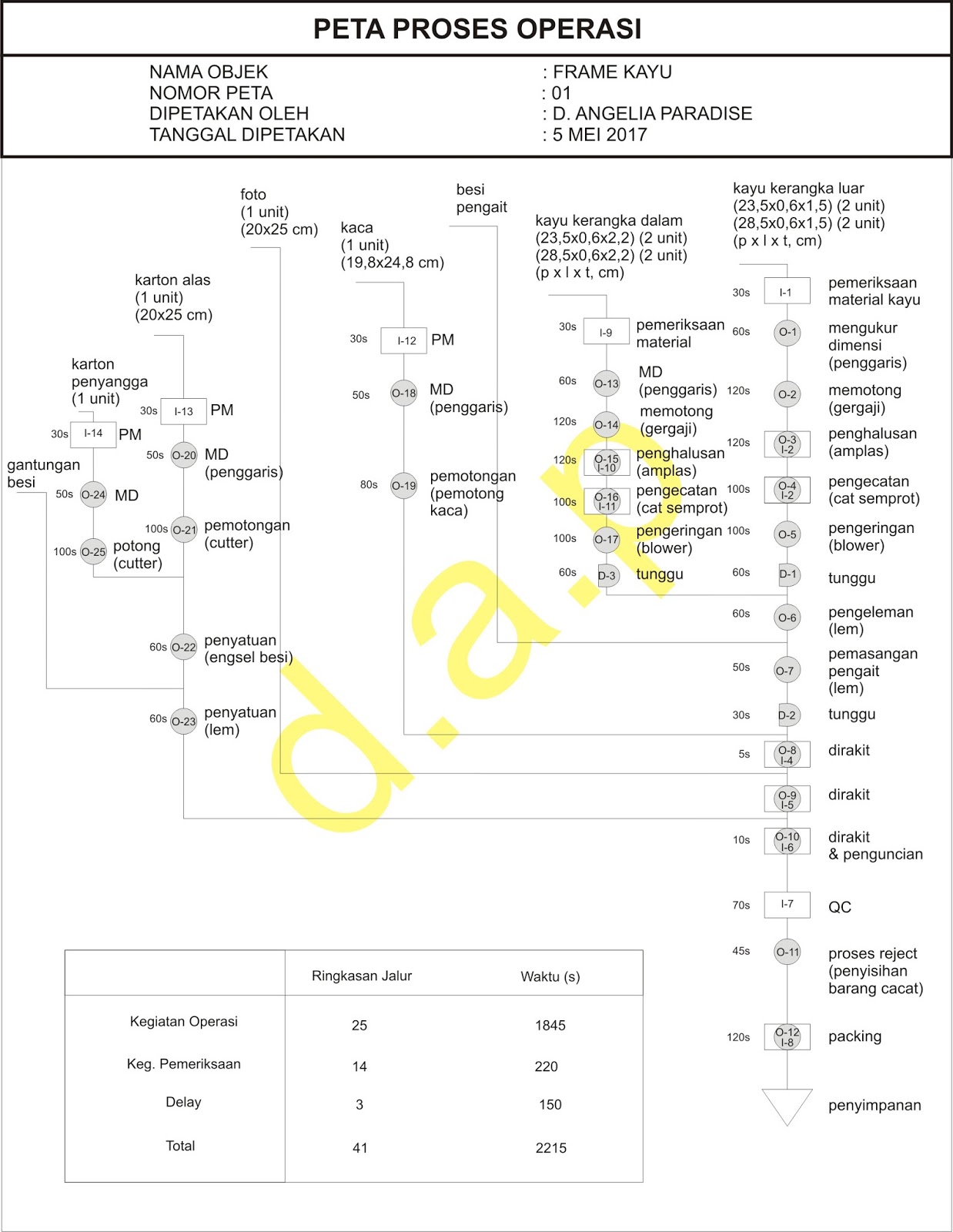 Mulai dari perakitan pemasangan bagian dan lain lain. Peta besar adalah jenis peta yang berskala 1. Menurut sutalaksana 2006 peta proses operasi merupakan suatu diagram yang menggambarkan langkah langkah proses yang akan dialami bahan bahan baku mengenai urutan urutan operasi dan pemeriksaan dari tahap awal sampai menjadi produk jadi atau komponen dan memuat informasi informasi yang diperlukan untuk menganalisis lebih lanjut seperti waktu material tempat alat dan mesin yang digunakan. Suatu peta proses operasi menggambarkan langkah langkah operasi dan pemeriksaan yang dialami oleh bahan dalam urutannya sejak awal sampai menjadi produk jadi utuh maupun sebagai bagian setengah jadi. Persiapan material kayu kaarton tebal dll. Peta ini memuat informasi tentang.