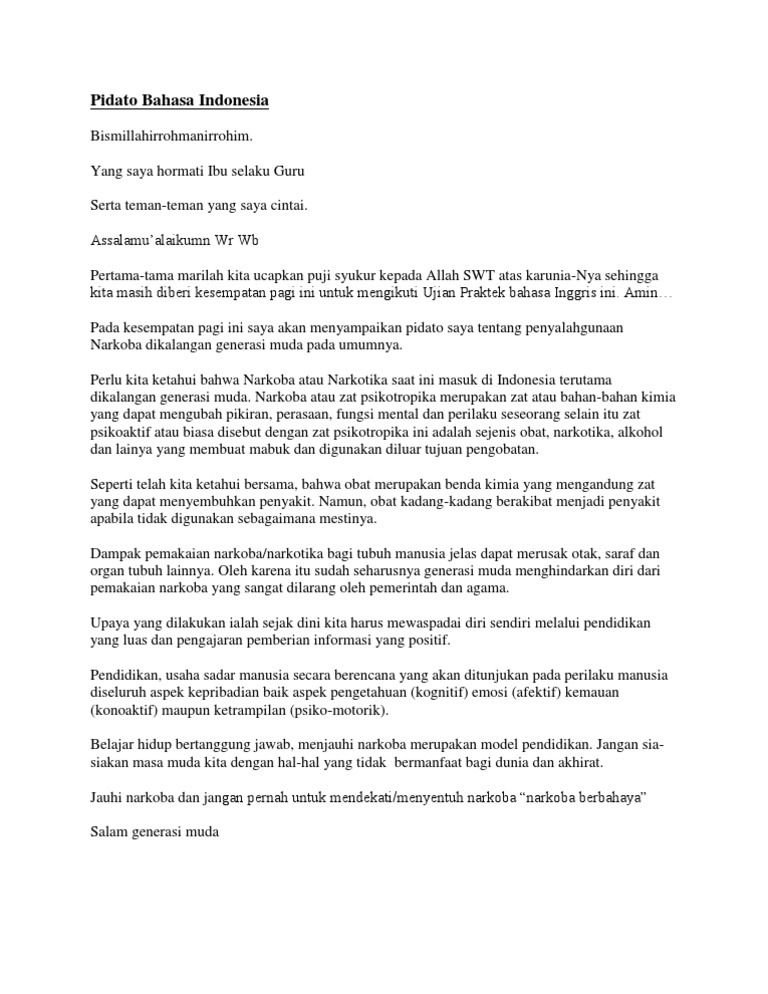 Berikut ini adalah beberapa contoh pidato yang dapat anda gunakan dalam. Naskah teks pidato seperti ini bisa anda baca di depan kelas untuk belajar membawakan pidato di depan umum. Pidato bahaya narkoba oke seperti biasanya saya akan memperkenalkan postingan saya sebelumnya yakni teks pidato tentang korupsi dan pidato perpisahan sekolah sma kali ini saya akan share naskah pidato bahaya narkoba. Berikut ini adalah contoh naskahteks pidato singkat dengan tema bahaya narkoba di kalangan remaja yang bisa menjadi referensi untuk yang sedang belajar cara membuat pidato sendiri. Contoh pidato tentang narkoba narkoba memang momok bagi setiap pelajar. Dan atas perhatiannya saya ucapkan banyak terima kasih.