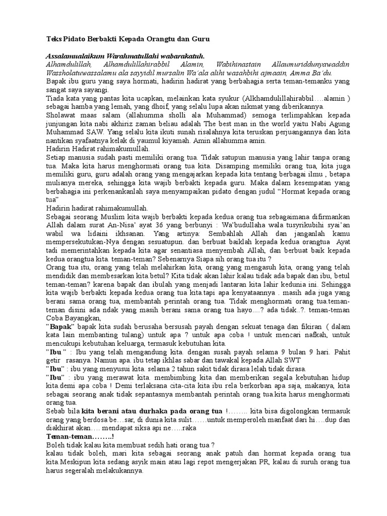 Rekan rekan dan para hadirin yang saya banggakan. Pidato bertema berbakti kepada orang tua islam menjadikan berbakti kepada kedua orang tua sebagai sebuah kewajiban yang sangat besarberbakti kepada kedua orangtua bisa diwujudkan dengan cara senantiasa mengasihi menyayangi mendoakan taat dan patuh melakukan hal hal yang membahagiakan hati serta menjauhi hal hal yang tidak disukai oleh mereka. Nama tempat dll agar ceramah anda di depan umum menjadi lebih indah. File berformat microsoft word documents docrtf silahkan download secara gratis dan kembangkan kembali agar lebih sempurna. Masih banyak contoh contoh lain tentang orang orang yang berbakti kepada orang tua baik di masa lampau maupun sekarang yang tidak mungkin kita ceritakan seluruhnya kebaikan tersebut mereka per sembahkan kepada orang tua sebagai balasan atas jasa jasa perhatian dan pemeliharaan mereka dan sebagai bukti pengakuan tulus dan akhlak mulia. Silahkan anda edit seperti.