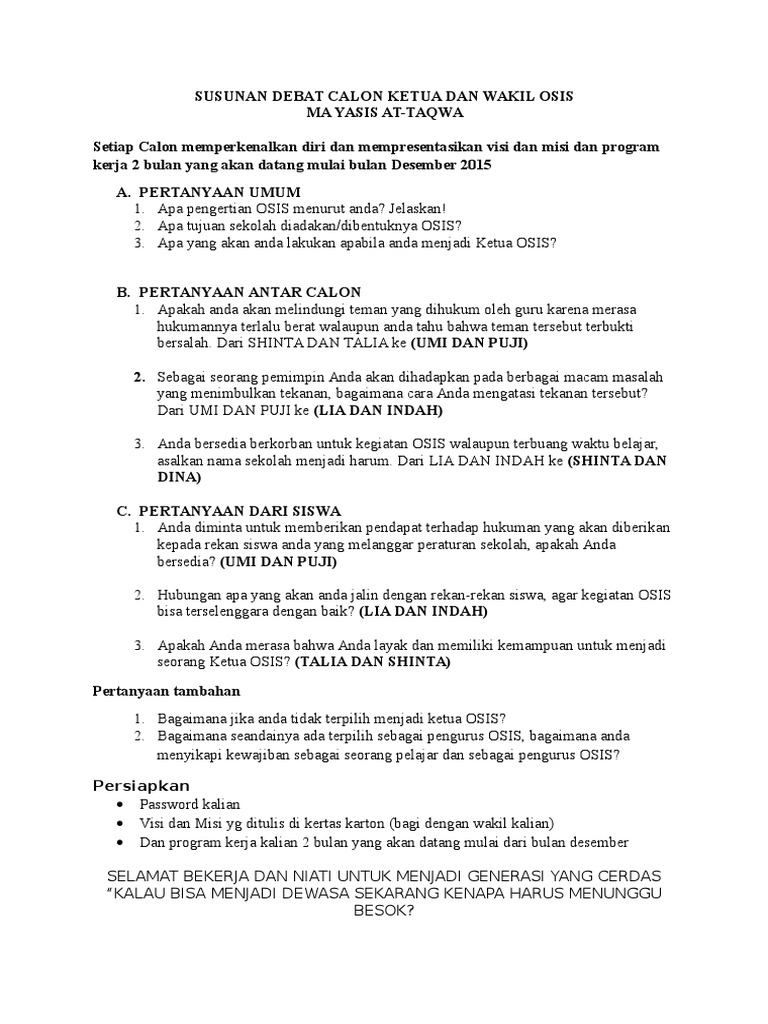 Contoh pidato kampanye calon ketua osis. Puji dan syukur saya panjatkan kepada allah swt karena atas rahmat nya lah kita bisa berada di tempat ini dalam rangka melaksanakan salah satu tahapan pemilihan ketua osis smpn 3 marabahan tahun ajaran 2012 2013. Yang saya hormati guru dan pembina osis yang saya hormati seluruh teman teman sekalian yang berbahagia sebelumnya saya ingin memperkenalkan diri dulu nama saya alamat sekedar untuk menyambung apa yang telah di sampaika oleh rekan saya tadi saya akan sedikit menambahka tentang visi dan misi kami ketika terpilih. Visi dan misi tersebut tentunya harus dapat dipertanggung jawabkan agar terwujudnya sebuah tujuan yang diinginkan oleh seluruh warga sekolah tersebut. Contoh pidato ketua osis baru 2016 sahabat cerpi pada kesempatan kali ini ceramah pidato akan share artikel mengenai contoh pidato ketua osis terbaru 2016yup tahun pelajaran baru 2016 telah kita masuki so pasti anak anak sekolah sudah mulai aktif pada kelas barunya. Contoh pidato kampanye calon ketua osis dalam bahasa inggris dan artinya. Saat menjadi calon ketua dan wakil ketua osis kita tentunya harus membuat sebuah visi dan misi yang mampu menarik perhatian pemilih untuk memilih kita menjadi ketua dan wakil ketua osis.