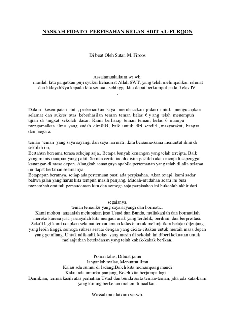 Berdasarkan isi yang disampaikan pidato terdiri atas berbagai macam jenisnya. Pidato perpisahan singkat dan mudah di hafal. Assalamu alaikum warahmatullahi wabarakatuh. Pidato perpisahan dalam contoh kali ini terdiri dari teksnaskah pidato yang berisi kata kata perpisahan sekolah sd smp sma atau kelas 6 9 12 dan perpisahan dalam acara wisuda sarjana. Anda dapat menggunakan pidato ini selama retret sekolah atau bahkan menambahkan kata kata jika masih ada. Di bawah ini adalah contoh pidato perpisahan kelas 6 sd yang panjang singkat dan mudah dihafal yang dapat anda gunakan sebagai panduan untuk mempersiapkan naskah.