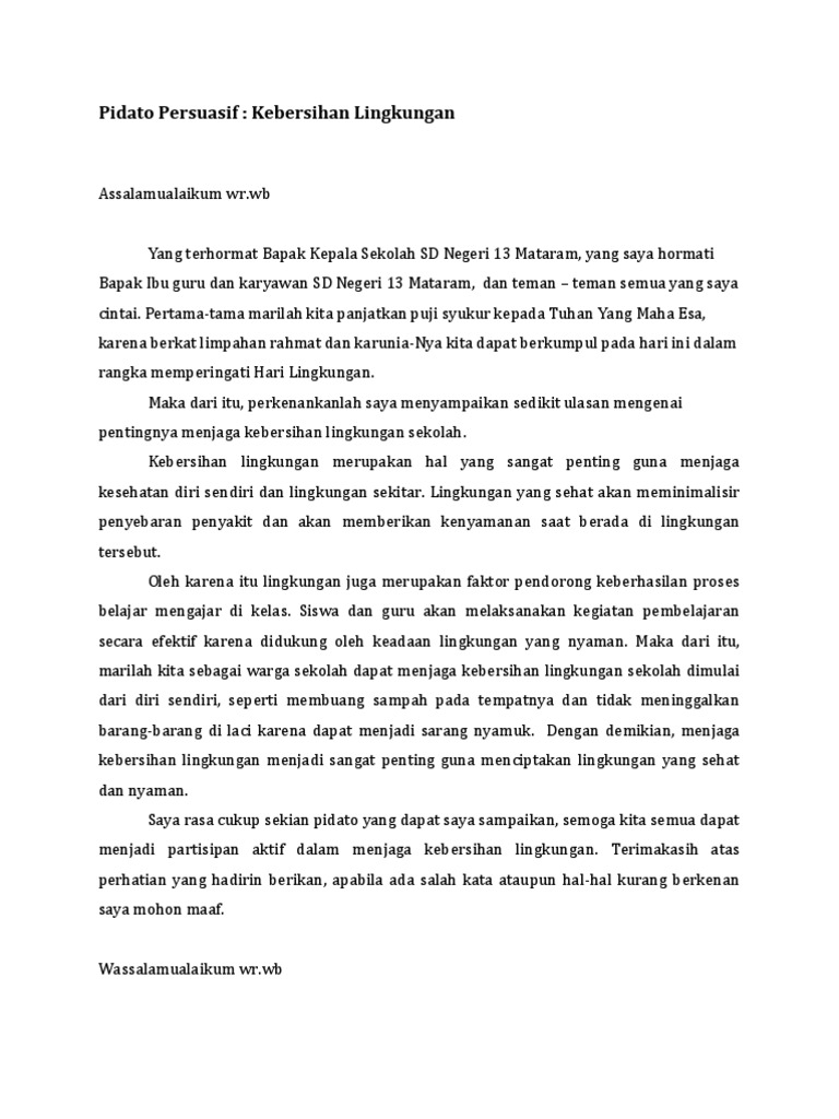 Contoh pidato singkat tentang lingkungan. Puji syukur kita panjatkan kehadirat tuhan yang maha esa karena berkat rahmat dan karunia nya jua lah kita dapat berkumpul dalam keadaan sehat walafiat tanpa kurang apapun. Teks pidato tentang lingkungan hidup. Silahkan mencermati contoh pidato tentang lingkungan berikut ini. Anda bisa menyimak contoh pidato singkat tentang lingkungan hidup berikut ini untuk mempelajari cara membuat teksnaskah pidato sendiri atau juga sebagai bahan latihan membawakan pidato di depan kelas. Kebersihan merupakan sebagian dari iman pentingnya menjaga kebersihan baik jasmani ataupun rohani dari lingkungan sekitar. Posting pada bahasa indonesia ditag cara membuat pidato cara pidato yang baik dan benar contoh pidato karya ilmiah contoh pidato panjang 5 lembar contoh pidato peduli lingkungan contoh pidato peduli lingkungan sekolah contoh pidato perpisahan contoh pidato persuasif contoh pidato persuasif tentang lingkungan contoh pidato singkat tentang kesehatan contoh pidato singkat tentang.