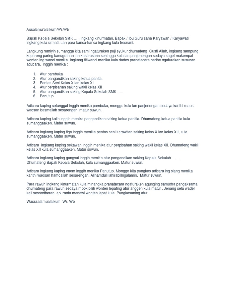 Contoh pranatacara perpisahan pranatacara perp i sahan sma n 1 wates assalamu alaikum wr. Contoh teks pranatacara bahasa jawa acara pengajian posting ini saya buat guna membantu mereka yang membutuhkan contoh teks pranatacara atau pembawa acara untuk kegiatan pengajian umum sebagaimana yang sering dilaksanakan. Contoh teks mc pernikahan manten bahasa jawa krama pada kesempatan kali ini saya akan memberikan contoh untuk teks mc dalam suatua pernikahan atau kalau dalam bahasa jawa sering di katakan manten dengan bahasa jawa yang baik dan benar. 2contoh teks pranatacara bahasa jawa acara pengajian assalaamualaikum warahmatullaahi wabarakaatuhu innalhamdalillaah nahmaduhu wanastainuhu wanastaghfirruhu wanauudzubillahi min syuruuri anfusina wa min sayyiati amaalina may yahdihillahu fala mudzillalah wa may yudlill fala haadiyalah asyhadu an laailaaha illallaah wahdahu laa syariikalahu wa asyhadu anna muhammadan. Mugiya kawilujengan lan kasarasan saking ngarsa dalem gusti alloh t. Wacana narasi diskripsi eksposisi argumentasi dan persuasi.