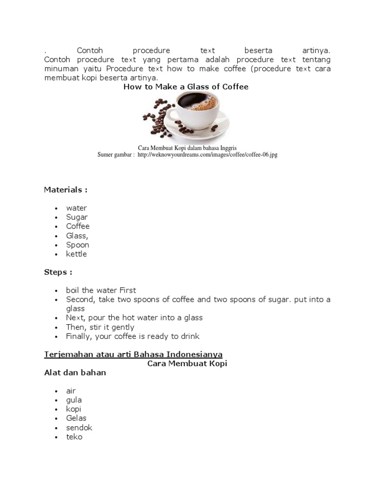 10 contoh proceduretext bahasa inggris dan terjemahannya belajar bahasa inggris hai sobat englishiana saya yakin anda semua sudah sangat familiar dengan sebuah text yang disebut procedure textlalu apakah anda pernah membuat contoh text procedure. Semoga dari contoh contoh di atas teman teman bisa membuat procedure text sendiri yang tentunya jauh lebih baik. Saran saya bagi yang sedang bingung karena tugas membuat procedure text sendiri ambilah kegiatanaktivitas yang sekiranya mudah dan tidak banyak memerlukan langkah langkah atau bahan bahan untuk mengerjakannya. Oiya jika terdapat kesalahan baik berupa penulisan maupun. Contoh procedure text tentang benda dan makanan beserta artinya bahasa inggris 17092017 05102017 contoh procedure text sebenarnya sudah banyak kita baca tanpa kita sadari. Contoh procedure text membuat procedure text itu sebenarnya mudah karena segala hal yang kita lakukan bisa dibuat ke dalam procedure text.