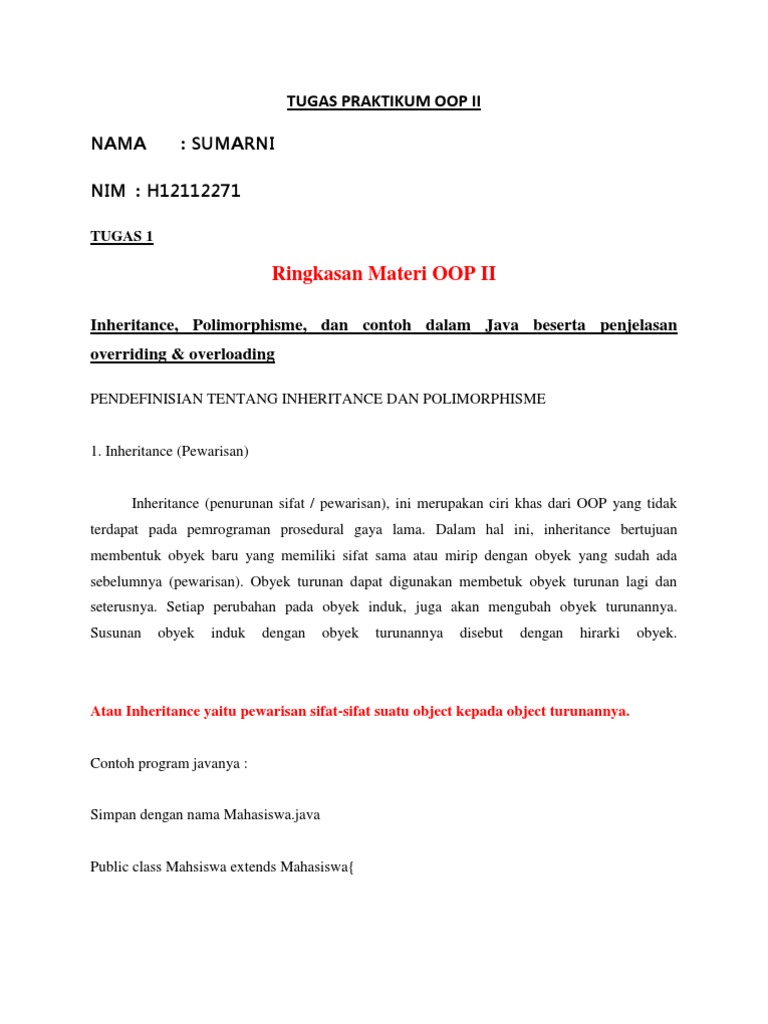 Beberapa dianatara kalian juga pasti membutuhkan adanya contoh program java. Pemuliaan tanaman adalah kegiatan mengubah susunan genetik individu atau populasi tumbuhan untuk suatu tujuan. Seperti yang sudah kita pelajari pada tulisan sebelumnya. Contoh hirarki class diperlihatkan di bawah ini. Kita harus sudah memahami konsep dasar bahasa program java terlebih dahulu. Inheritance proses pewarian data dan method dari suatu kelas kepada kelas lainkelas yang mewariskan disebut super class sedangkan kelas yang diwariskan sering disebut sub classdengan inheritance class yang baru subclass akan mirip dengan class yang lama superclass namun memiliki karakteristik yang barucontoh pewarisan.