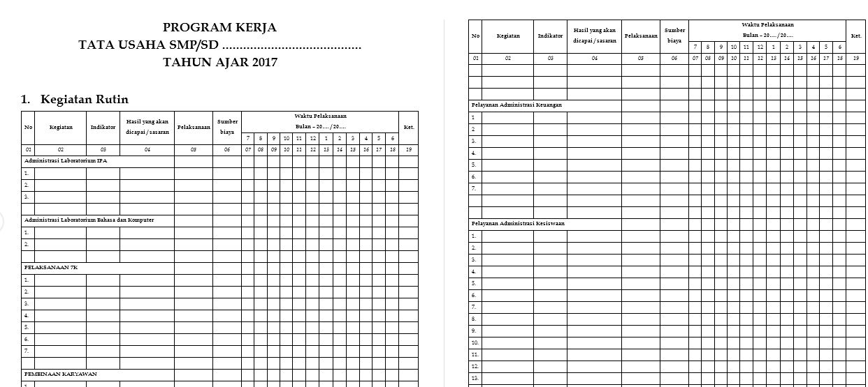 Contoh program kerja tata usaha sekolah. Program kerja tata usaha sekolah adalah program yang disusun tenaga administrasi diawal tahun ajaran atau tahun anggaran untuk digunakan sebagai pedomanacuan dalam melaksanakan tugas ke tata usahaan sekolah. Program tata usaha menitik beratkan pada tersusunnya administrasi di sekolah misalnya administrasi kepegawaian kesiswawaan sarana dan prasarana pembelajaran dan lain lain. 35 contoh format administrasi tata usaha sekolah sdmismpsma lengkap ini berkaitan dengan administrasi administrasi ketatausahaan sekolah aplikasi tata usaha sekolah dengan excel download aplikasi tata usaha sekolah gratis merupakan file berkas untuk kepala sekolah guru ops tata usaha dan staf pendidik lainnya. File file pendidikan yang berada disini bertujuan untuk menambah wawasan. Tata usaha sekolah memegang peranan penting dibidang administrasi pengelolaan sekolah untuk itu dalam pelayanan pendidikan di sekolah perlu adanya program terstruktur tentang program kerja tata usaha sekolah program kerja tata usaha sekolah dibuat sebagai pedoman pelaksanaan pekerjaan bagi masing masing tenaga tata usaha untuk memberikan pelayanan secara maksimal baik pelayanan pendidikan. Format program kerja dan administrasi tu tata usaha lengkap ini mungkin bermanfaat juga bagi anda yang membutuhkan referensi untuk perbandingan terkait dengan program kerja tata usaha smp doc program kerja tata usaha sma negeri program kerja tata usaha smk contoh program kerja tata usaha sekolah dasar program kerja tata usaha smk doc.