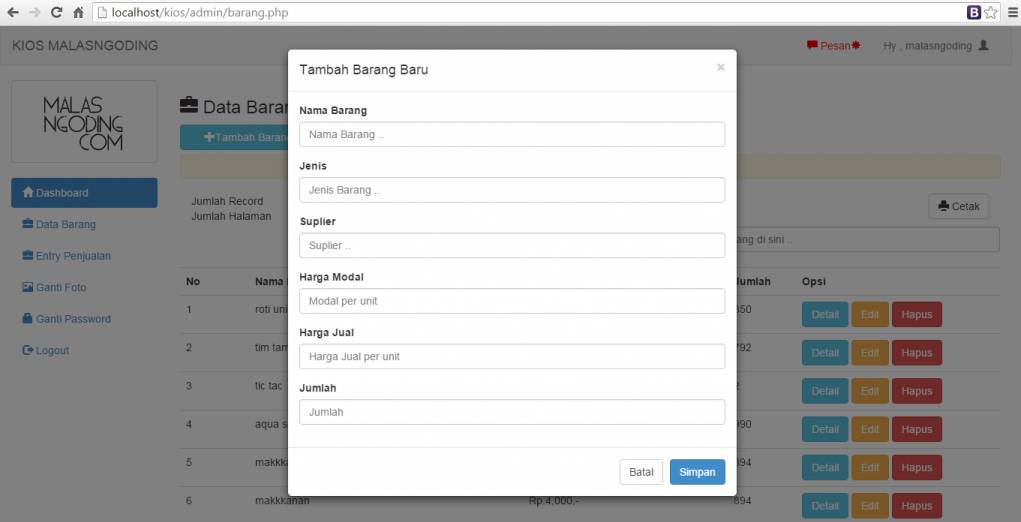 Contoh program penjualan menggunakan php dan mysql. Koneksiphp dalam satu folder di tempat penginstalan xampp kamu. Program aplikasi penjualan dan stok barang ini dipakai untuk layanan kasir yaitu untuk transaksi kasir toko. Jadi maklum saja jika sangat sederhana. Pada kesempatan ini kita akan belajar menggunakan php dan mysql untuk membuat aplikasi sederhana. Pada kesempatan baik ini kami akan memberikan sebuah tutorial tentang bagaimana cara membuat form input data dengan php dan mysql membuat suatu form input data berbasis web menggunakan script pemrograman php kemudian data tersebut akan tersimpan didalam database mysqlsebagai contoh adalah input data mahasiswa yang terdiri dari field atribut id. Aplikasi ini saya buat beberapa tahun yang lalu ketika saya mulai belajar php dan bootstrap.