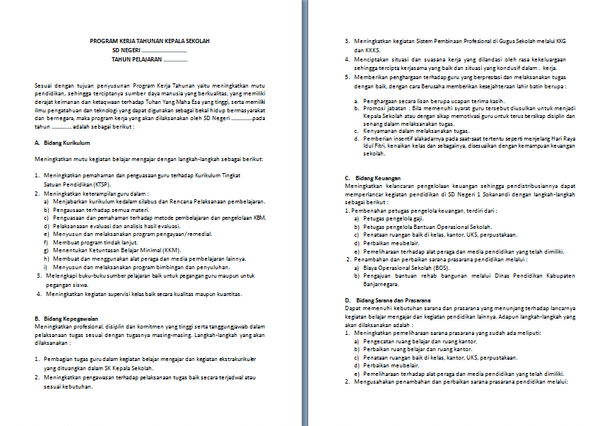 Tips untuk rekan rekan pendidik ketika membuat program kerja kepala sekolah sd alangkah baiknya berbentuk format doc untuk memudahkan anda dalam mengedit isi dari dokumen kerja. Kompetensi kelulusan program. Pelaksanaan supervisi monitoring dan evaluasi keterlaksanaan program dan hasil hasilnya dalam kerangka memperoleh umpan balik untuk memperbaiki rks selanjutnya. Sesuai dengan tujuan penyusunan program kerja tahunan yaitu meningkatkan mutu pendidikan sehingga terciptanya sumber daya manusia yang berkualitas yang memiliki derajat keimanan dan ketaqwaan terhadap tuhan yang maha esa yang tinggi serta memiliki ilmu pengatahuan dan teknologi yang dapat digunakan sebagai bekal hidup bermasyarakat dan bernegara maka program kerja yang akan. Download file via google drive sebagai dasar pembelajaran dalam membuat format tersebut kami berikan aplikasi administrasi kepala sekolah agar bisa mempercepat cara kerja anda. Pendahuluan literasi tidak sekedar membaca dan menulis namun mencakup keterampilan berpikir menggunakan sumber sumber pengetahuan dalam bentuk cetak visual digital dan auditori.