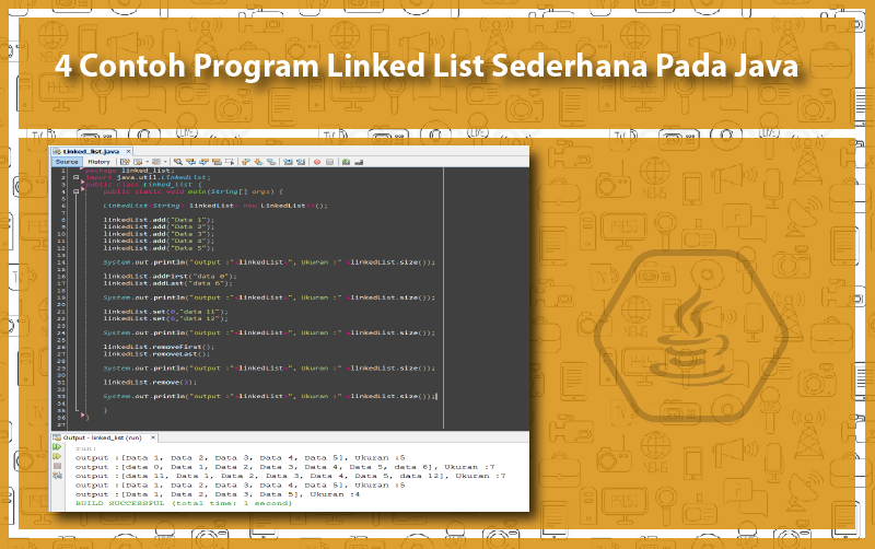Linked list linked list adalah sekumpulan elemen bertipe sama yang mempunyai keterurutan tertentu yang setiap elemennya terdiri dari dua bagian linked list juga merupakan suatu cara untuk menyimpan data dengan struktur sehingga dapat secara otomatis menciptakan suatu tempat baru untuk menyimpan data yang diperlukanstruktur ini lebih dinamis karena banyaknya elemen dengan mudah ditambah. Linked list atau single linked list merupakan suatu bentuk struktur data yang berisi kumpulan data yang disebut sebagai node yang tersusun secara sekuensial saling sambung menyambung dinamis dan terbatas.