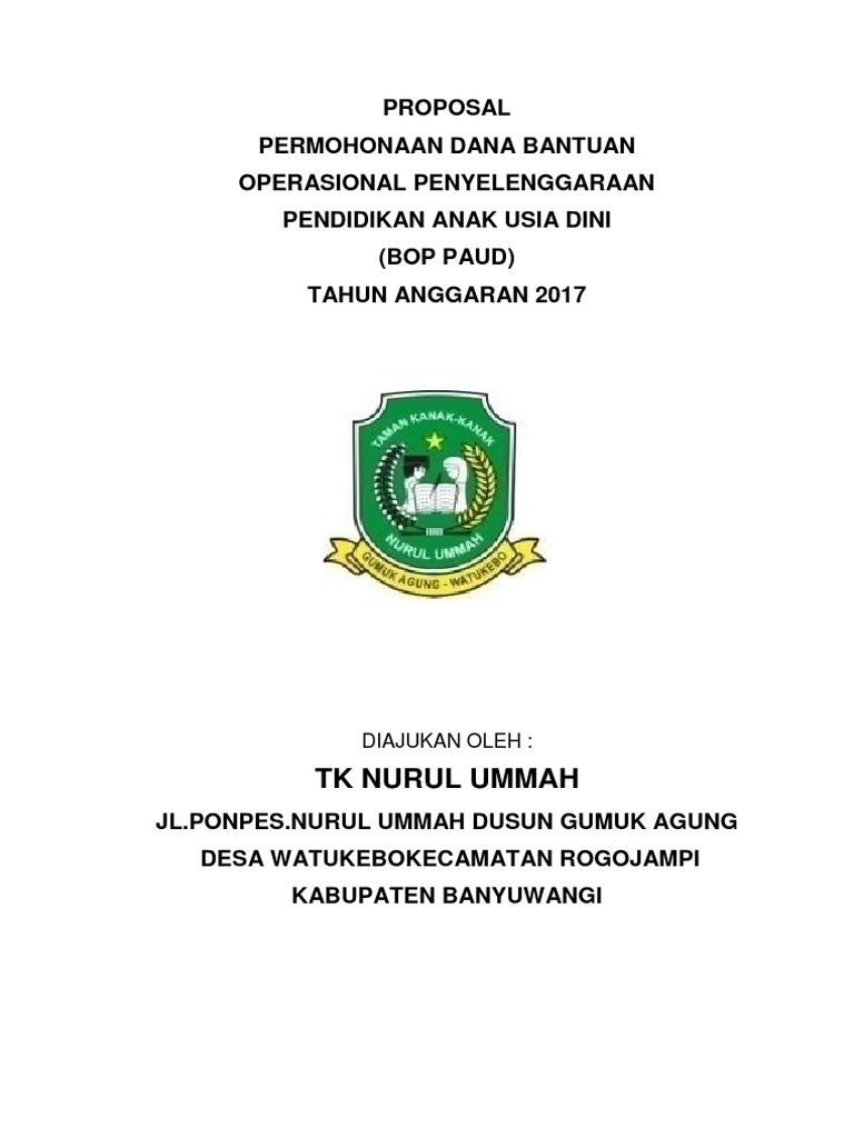 Anda dapat melihat preview sebelum mendownload guna menghindari kesalahan pemilihan file. Contoh proposal bop paud 2017 new update 20172018 dokumen guru sekolah ini ditujukan bagi siapa saja yang membutuhkan untuk digunakan sebagai referensi sesuai keperluan baik itu di lingkungan sekolah pendidikan dan kesehatan ataupun umum untuk guru bahkan operator sekolah. Newer post older post home. Post comments atom popular posts. Proposal bop paud merupakan file yang harus anda buat dengan baik dan benar agar apa yang anda ajukan pada isi proposal tersebut dapat di terima maka dari itu pembuatnya harus memiliki unsur unsur yang. Tidak hanya untuk paud saja tapi contoh format proposal bop paud ini dapat digunakan untuk lembaga pendidikan sejenis lainnya seperti tk kelompok bermain ra atau tpa dllproposal bop paud ini bisa menjadi langkah awal untuk lembaga paud anda dalam mendapatkan bantuan operasional paud.