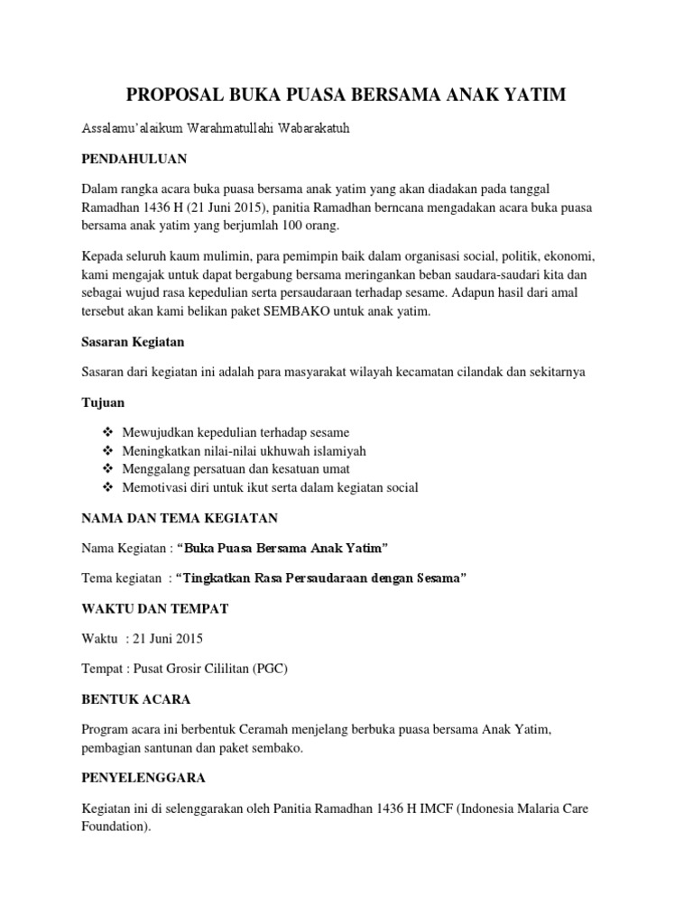 Contoh proposal buka puasa bersama. Alam semesta merupakan anugerah allah swt yag harus kita syukuri. Bulan ramadhan 143 9 h. Karena karunianya kami dapat menyelesaikan proposal kegiatan berbuka bersama yang mana merupakan program tahunan dari ikatan remaja masjid al jamiyyah. Jumat 17 juni 2016 pukul 1730 berbuka puasa anak yatim akan diadakan di pendopo fakultas ekonomi dan bisnis dengan diisi penceramah oleh ust irsyad lubis serta pembagian santunan kepada anak yatim. Contoh proposal buka puasa bersama januari 1 2012 5 november 5 priyayi chips made in purworejo central java. Contoh proposal buka puasa bersama perusahaan.