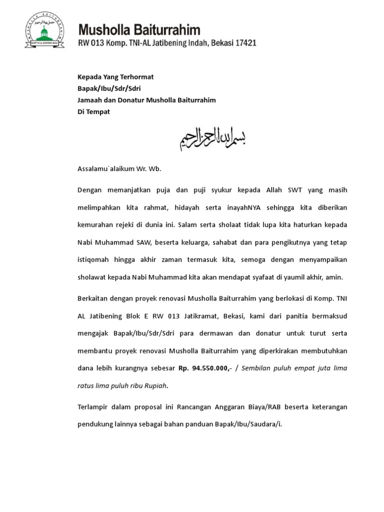 Demikian proposal pembangunan mushola al mubaroq ini disampaikan dengan harapan semoga terwujudnya masjid ini dapat menjadi sarana untuk meningkatkan iman dan taqwa kepada allah swt bagi umat islam. Proposal permohonan bantuan dana pembangunan musholla al amin pada desa kedung malang kecamatan kedung kabupaten jepara telah disusun berdasarkan kondisi dan kebutuhan yang riil. Musholla al amin. Contoh proposal permohonan bantuan pembangunan kantor balai rukun tetangga pada kesempatan kali ini saya akan memberikan contoh pembuatan proposal guna untuk permohonan bantuan dana pembangunan kantor balai rukun tetangga contoh proposal dibawah ini sebenarnya adalah contoh proposal yang sesungguhnya yang di pakai kampung saya untuk di tujukan ke balai desa potorono untuk permohonan bantuan. Jika membutuhkan file word nya silahkan bisa kunjungi download contoh proposal pembangunan musholla.