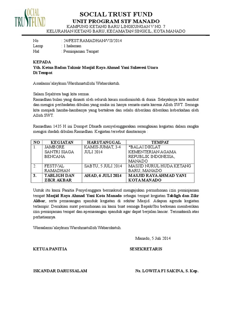 Contoh proposal peminjaman tempat kegiatan. Contoh surat peminjaman tempat bermacam kegiatan yang diselenggarakan dengan meminjam tempat sebagai referensi surat peminjaman yang baik. Contoh proposal permohonan bantuan dana untuk kegiatan a. Contoh surat permohonan izin seperti surat surat lainnya yang memiliki beragam jenis di sebabkan oleh tujuan pembuatan dan fungsi surat yang berbeda yang sebelumnya sudah di bahas di blog ini seperti surat permohonan bantuanpada kesempatan kali ini kami akan mencoba menulis surat permohonan izin yang pada intinya tujuan yang di miliki adalah sama yaitu isinya tentang pengajuan permohonan. Contoh surat izin peminjaman tempat yang akan kami berikan ini adalah beberapa contoh kata kata penulisan yang mungkin bisa anda contoh. Contoh proposal yang paling sering dibuat tidak hanya dalam kalangan organisasi tetapi dilingkungan sekolah juga sering membuat proposal untuk kegiatan dalam lingkup sekolah seperti proposal kegiatan pentas seni pensi.