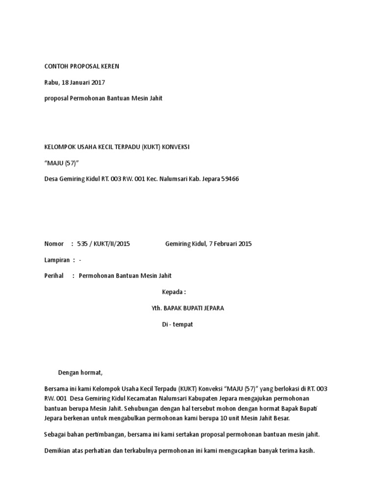 Academiaedu is a platform for academics to share research papers. Demikian proposal ini saya buat semoga bermanfaat sebagai pegangan dalam mendirikan usaha dan sebagai tolak ukur keberhasilan usaha. 5 usaha jahit ini paling prospektif. Hengki wijaya stp mth mata kuliah. Kepala dinas pemberdayaan perempuan dan kb oleh kelompok soneangka kabuapten muna propinsi sulawesi tenggara 2012 2. Ktp kartu tanda penduduk.
