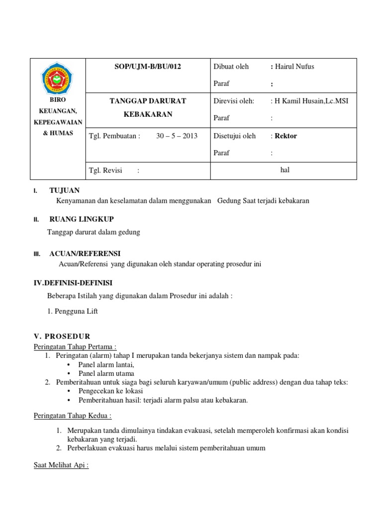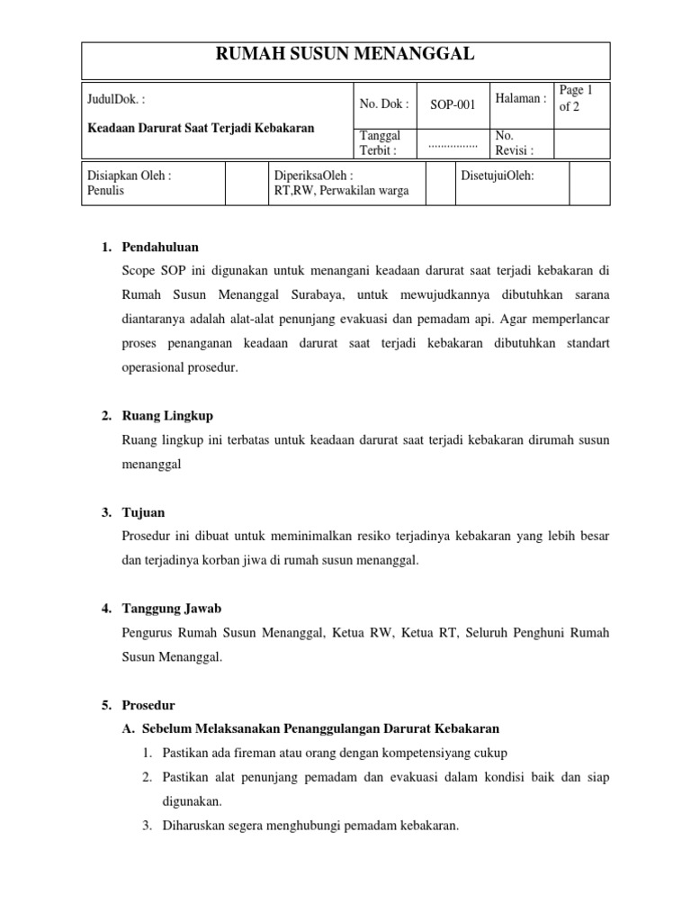 Melakukan pemantauan kebutuhan dan perawatan sarana dan prasarana tanggap darurat perusahaan. Laporan evaluasi sistem kesiagaan dan tanggap darurat pt xxx menyampaikan hasil evaluasi simulasi tanggap darurat kebakaran dan tumpahan b3 untuk memastikan penerapan standar ketentuan pengelolaan tanggap darurat yang diberlakukan di internal perusahaan pt xxx dengan mempertimbangkan faktor keselamatan kesehatan kerja lingkungan dan keamanan health safety environment security yang. Bagian ini menjelaskan mengenai alat yang digunakan dalam pelaksanaan standar operasional perusahaan. Anggota tim yang ditunjuk bertanggung jawab mengambil langkah penyelamatan sesuai prosedur yang dimiliki jika terjadi kondisi darurat akibat gempa bumi. Jika keadaan darurat tidak dapat ditangani oleh team penanggulangan keadaan darurat maka koordinator team harus segera menghubungi pihak luar yang terkait untuk meminta bantuan. Menyediakan perlengkapan keadaan darurat seperti apar dan sirine kotak p3k jalur jalur evakuasi assemblly point tempat berkumpul yang sesuai dengan fungsi dan kegunaannya.