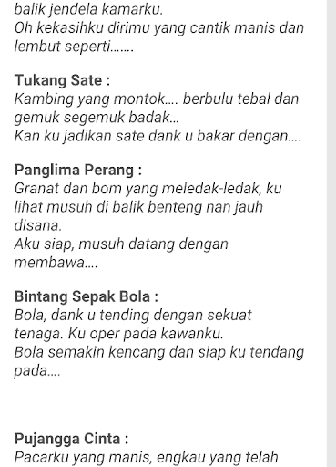 Puisi berantai semakin lucu jika diperankan oleh 3 4 atau 5 orang yang membawakan tema berbeda beda seperti beberapa contoh di atas. Pusi berantai lucu untuk 3 orang yang diperankan oleh pecinta pejuang dan penjual telur yang kocak dan lucu.