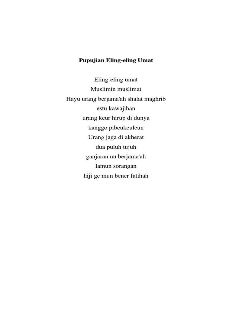 Diposting oleh unknown di 1107. Pupujian yaitu untaian kata pujian untuk allah dan nabi muhammad sawdi kampung saya kalau setelah adzan sambil menunggu komat biasanya suka ada pupujian. Demikian kumpulan pupujian atau nadoman dalam bahasa sunda yang saya bagikan semoga bisa bermanfaat bagi sobat yang ingin mengenang masa masa kecil waktu di mengaji. Pupujian pupujian nyaéta puisi buhun anu eusina nyoko kana ajaran agama islampupujian asalna tina sair nyaéta puisi anu asalna tina sastra arabku lantaran kitu pupujian mah wangunna téh méh taya bédana jeung sair diwangun ku opat padalisan dina sapadana sarta unggal padalisanna diwangun ku dalapan engangtapi sanajan kitu aya ogé anu diwangun ku dua padalisan genep padalisan. Kumpulan pupujian atau nadom dalam bahasa sunda lengkap pupujian adalah lantunan berupa lagu yang isinya berupa pepeling pepatah atau ajakan shalat atau ajakan berbuat baik lainnya yang biasanya dilantunkan setelah adzan pupujian bahasa sunda ini paling sering dinyanyikan oleh para santri sebelum shalat asharmagrib atau isya.