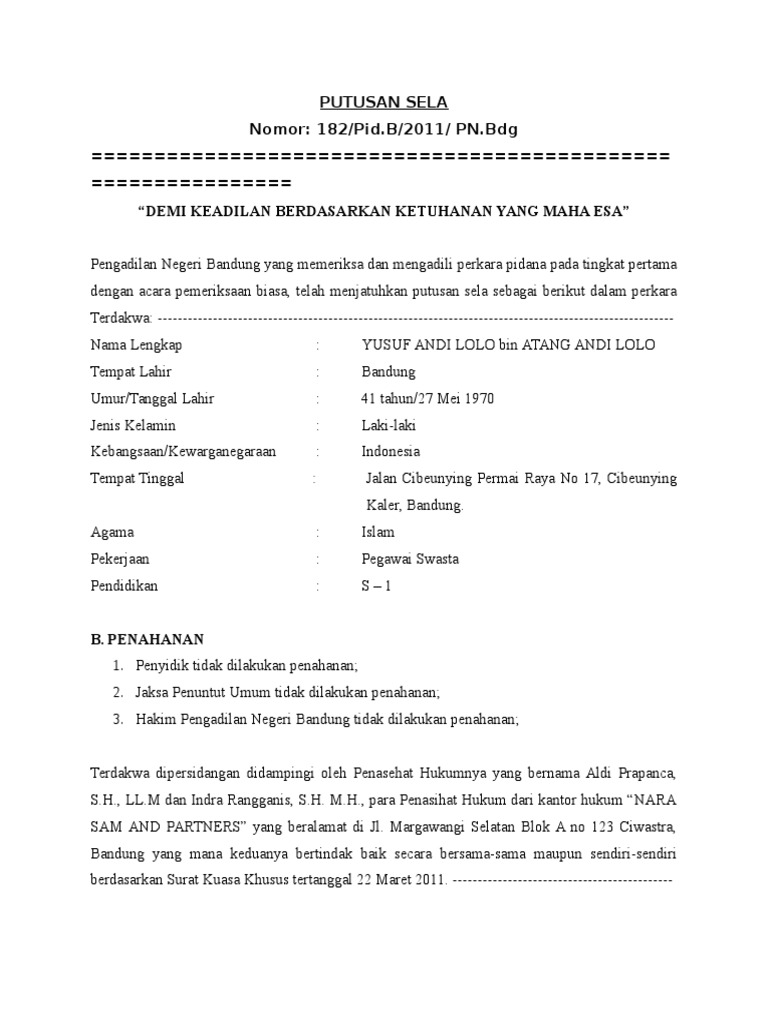 Contoh putusan sela perdata. Demikianlah dipputus dalam rapat permusyawaratan majelis pada hari kamis tanggal 2 mei 2014 yang terdiri dari eka annisa salam sh. Contoh putusan sela tingkat pertama dan tingkat banding putusan sela yang mengabulkan eksepsi ph putusan sela pengadilan negeri wonosari nomor. Contoh putusan sela penggugat yaitu penyewa rumah mengajukan gugatan perdata terhadap tergugat yang telah merusakkan atap rumah sewaan sedangkan waktu itu adalah musim hujan. Putusan yang berhubungan dengan adanya insiden tertentu yakni timbulnya. Dalam hal ini berkaitan dengan suatu peristiwa apabila terdakwa atau penasihat hukum mengajukan suatu keberatan bahwa pengadilan tidak berwenang mengadili perkaranya atau dakwaan tidak dapat diterima atau surat dakwaan harus dibatalkan. Nomor 44 pdtg2015pn kis tentang putusan sela terhadap eksespsi kompetensi absolut atas keluarnya putusan mk no.