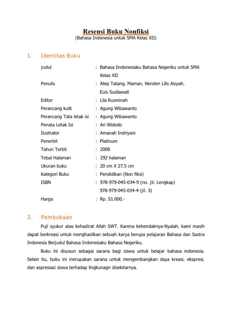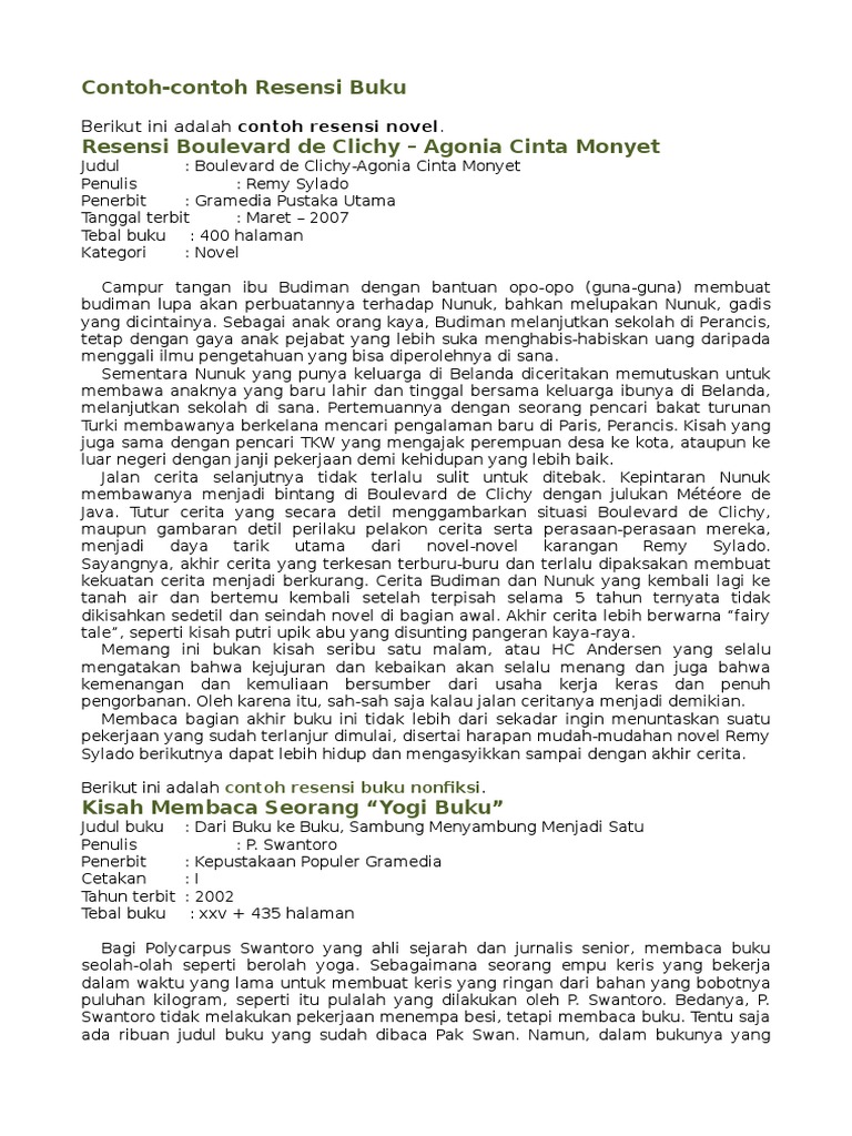 Contoh resensi buku kamu sedang mencari informasi perihal resensi buku untuk tugas sekolah atau ingin belajar mengenai cara meresnsi yang baik dan benar beserta contoh resensinya. Contoh resensi buku mata pelajaran. Contoh resensi buku apakah anda pernah mendengar kata resensi memang benar jika kata resensi adalah kata yang sangat serig kita dengar namun banyak juga orang yang belum paham apa itu resensi sehingga banyak yang kebingungan jika harus melakukan resensi buku. Pada artikel ini kami akan membantu kamu memahami apa itu resensi buku dan membahas mengenai contoh resensi buku yang baik dan benar. Pusat pembukuan departemen pendidikan nasional. Macam atau jenis buku yang berisi informasi tentang jenis buku yang diresensi.
