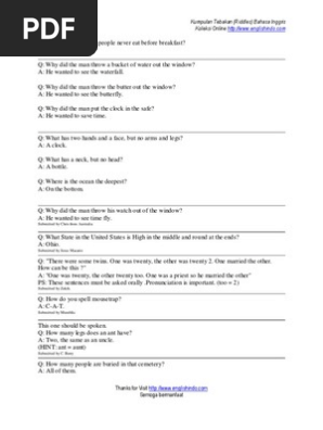 30 tebak tebakan lucu bahasa inggris riddles paja tapuih. Langsung saja yuk kita simak 25 contoh teka teki menarik dalam bahasa inggris ini. You blow me hard. Kumpulan peribahasa dalam bahasa inggris proverb dan maknanya memberikan gambaran jika dalam bahasa inggris itu sangat luas yang dimana tentu saja kita akan menemukan banyak pribahasa yang memiliki arti dan makna yang mendalam yang bisa kalian jadikan sebuah kalimat yang bak. The more you take the more you leave behind. Tebak tebakan dalam bahasa inggris ini bisa digunakan sebagai cara belajar bahsa inggris yang menyenangkan.